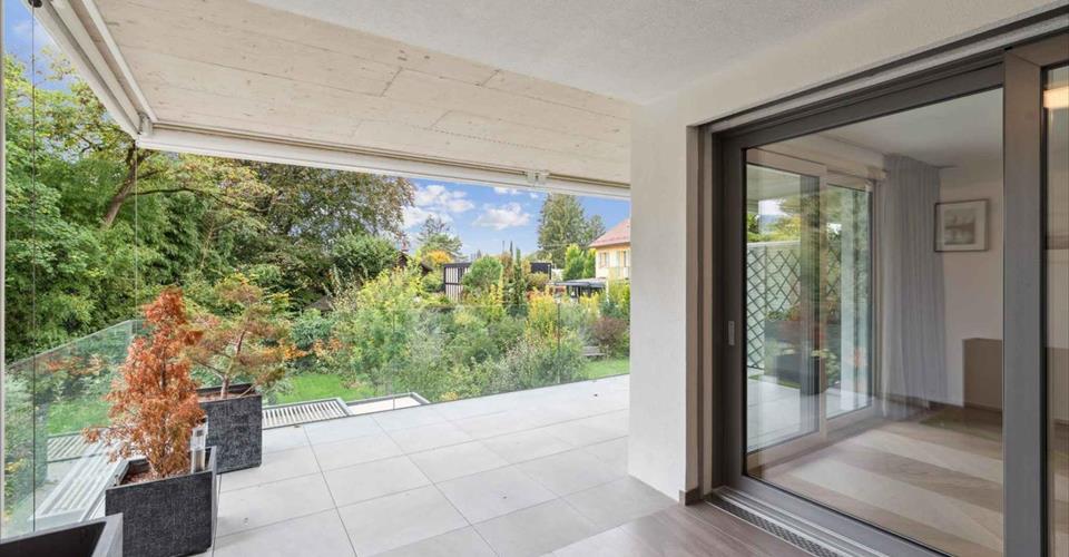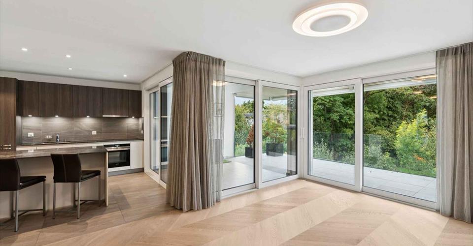 Au calme absolu, entouré de verdure et sans vis-à-vis, ce bien d’exception est situé sur la commune de Chêne-Bourg, au coeur d’une petite résidence de standing et sécurisée, construite en 2019 et dotée du label Minergie (chauffage par pompe à chaleur, triple vitrages, double flux..) D’une surface PPE d’env. 91 m2, ce splendide appartement résolument contemporain a été aménagé avec de magnifiques matériaux. Sa double orientation S-O et toutes ses baies vitrées lui confèrent une luminosité optimale. Il bénéficie d’une spacieuse terrasse d’environ 30 m2 offrant une magnifique vue dégagée sur la nature environnante. La partie jour se compose d’un hall d’entrée avec placard, d’une cuisine parfaitement agencée ouverte sur le séjour et la spacieuse terrasse. La partie nuit offre deux belles chambres à coucher et deux salles de bain avec toilette (dont une en suite). En annexe, une cave individuelle et deux place de parking intérieures (avec prises électriques) complètent agréablement le tout. Coup de coeur assuré pour le cadre paisible et la situation idyllique à proximité immédiate du Ceva et à moins de 10′ du centre-ville de Genève.