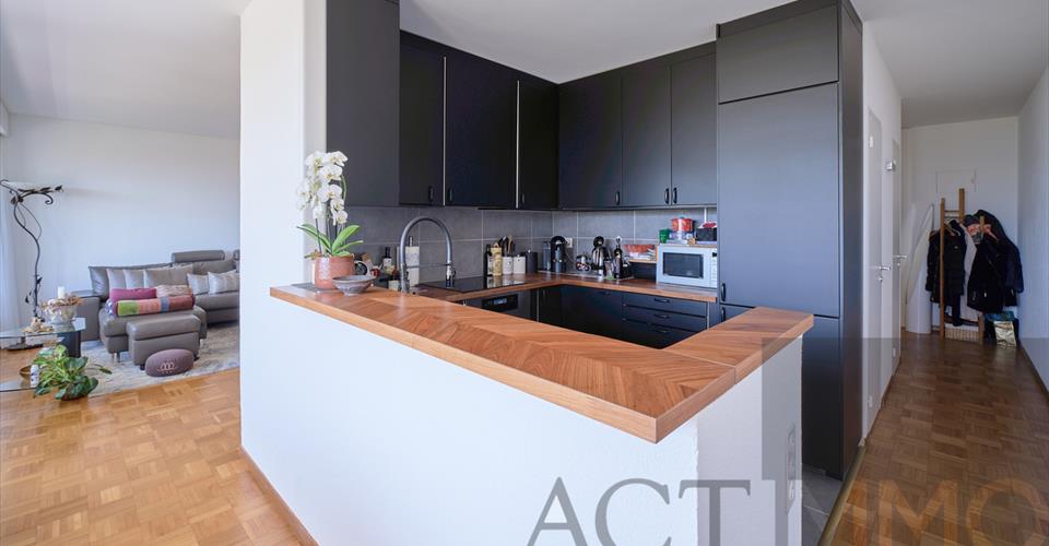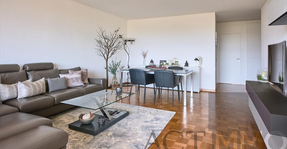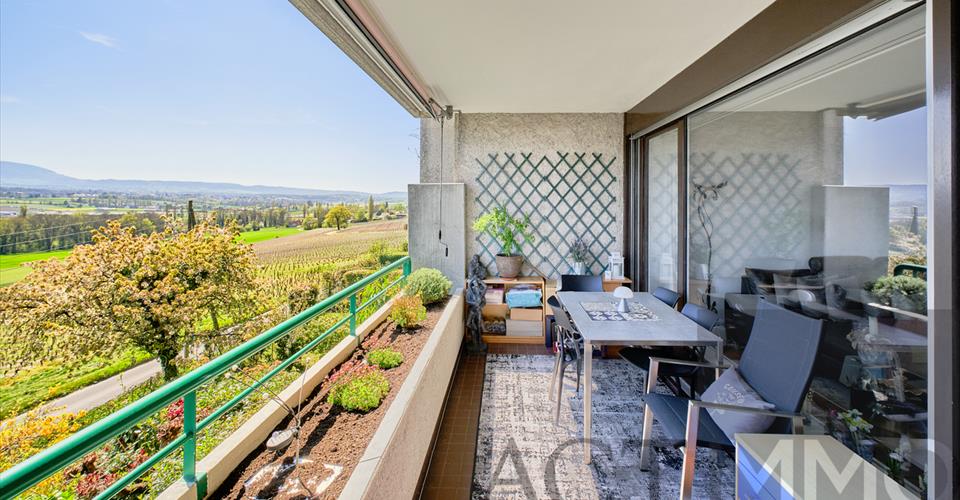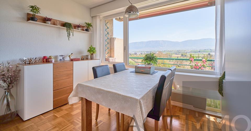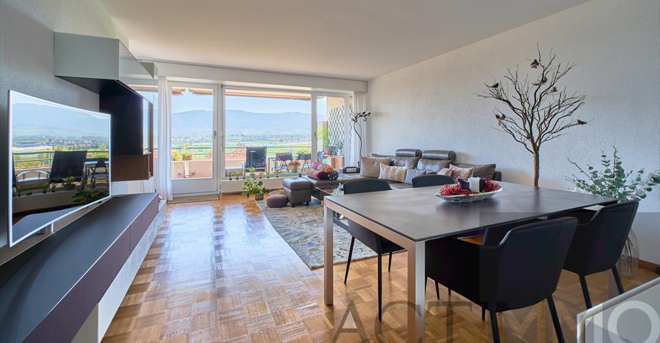 Situé au cœur de la campagne genevoise, dans la charmante commune de Confignon, ce spacieux 4 pièces se trouve dans un petit immeuble résidentiel au calme, à proximité immédiate des commodités du village et des accès vers la France et Lausanne. Atouts majeurs : une loggia de 18 m² orientée plein sud, une vue imprenable sur le Vuache, le Salève, les Voirons et une échappée sur les Alpes. L’appartement se compose d’un hall d’entrée, d’un vaste séjour lumineux, d’une cuisine équipée, de deux grandes chambres avec rangements, d’une salle de bains avec WC, ainsi qu’une salle de douche. Une cave et une place de parking couverte complètent ce bien. Actuellement loué (CHF 3’200 + charges CHF 200 + parking CHF 180) jusqu’au 31 mars 2028, cet appartement représente une opportunité d’investissement.