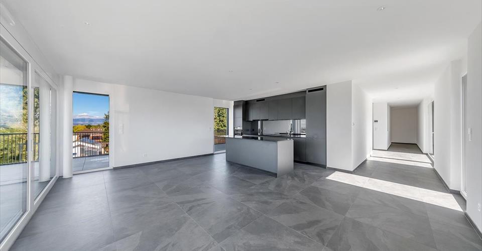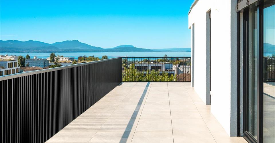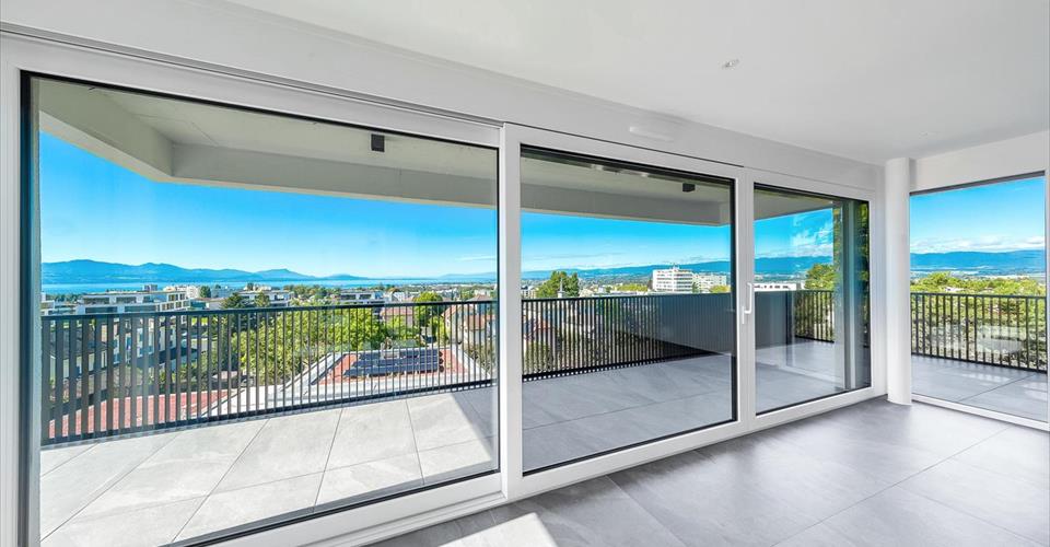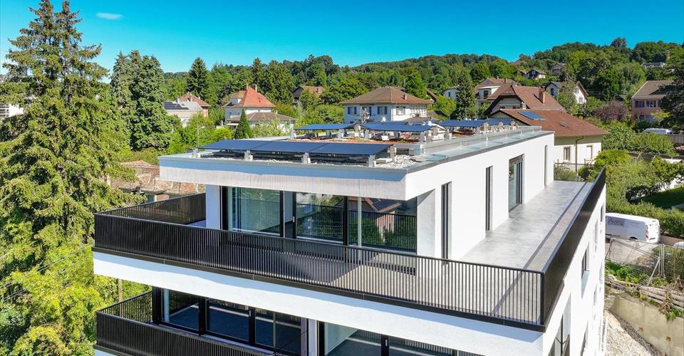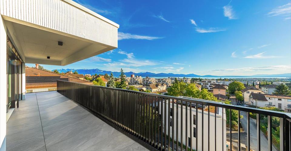Situé sur les hauts de Prilly, face au lac, bénéficiant d’une vue panoramique sur 3 côtés, magnifique appartement en attique de 4,5 pces, 111 m2 hab., agrémenté de 135 m2 de terrasse et balcon, au 3ème étage d’une toute nouvelle PPE construite cette année de 9 appartements. Situation calme et très ensoleillée, à proximité des transports (bus) et des commerces. Construction de standing, triple vitrage, chauffage au sol par pompe à chaleur géothermique, ascenseur avec accès appartement, appartement agencé avec goût, orienté sud. DESCRIPTIF – Entrée (accès ascenseur+escaliers) avec armoire dressing – Grande pièce composée d’une belle cuisine agencée avec îlot central ouverte sur salle-à -manger et séjour avec accès terrasse – Salle-de-bains-wc-lavabo double, armoire pour colonne de lavage-séchage – 3 belles chambres avec sol en parquet, accès terrasse – Wc-lavabo-douche Annexes : Cave – 2 parkings intérieurs