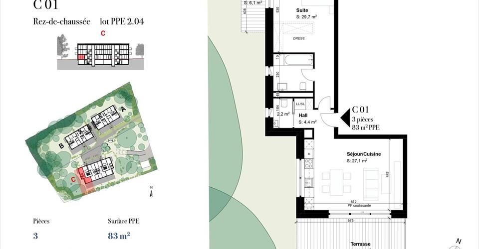 Ce superbe appartement de 3 pièces est situé au rez-de-chaussée du bâtiment C de la résidence le CLOS DES CHARMES. Il propose une propose de généreux et lumineux volumes pour une surface PPE de 83 m², une terrasse de 36 m² et un jardin de 189 m². Une place de parking en sous-sol et une cave viennent compléter ce superbe objet. Le CLOS DES CHARMES est un projet novateur et audacieux, situé au calme absolu dans un parc de 8’000 m². D’une architecture résolument contemporaine, cette résidence se compose de trois bâtiments parfaitement intégrés dans leur environnement, offrant 28 appartements du 3 au 6 pièces. Les lignes fluides et les volumes savamment orchestrés offrent de généreuses et profondes terrasses, balcons et jardins, idéalement exposés et tournés vers la nature. Les appartements, judicieusement orientés, bénéficient de prestations de haut standing et viennent confirmer le caractère unique de la résidence. Leur luminosité est garantie par les larges vitrages. Les cuisines ouvertes sur les séjours, dont l’agencement invite au partage et à la convivialité, permettent d’optimiser les volumes et d’apporter une sensation d’espace et de liberté. En surface, un lieu d’échange et de vie est créé pour les habitants. Les aménagements piétonniers donnent accès au magnifique parc arboré, concourant ainsi à la tranquillité des lieux. La circulation des véhicules se fera uniquement en sous-sol, les bâtiments étant reliés par un parking souterrain. La proximité des commodités, des écoles, collèges, commerces, transports publics et axes principaux font partie des atouts de cette élégante résidence à taille humaine et répondant aux normes THPE (Très Haute Performance Energétique). Les chemins piétonniers qui sillonnent le quartier, la Voie Verte à proximité, permettent de se déplacer au quotidien en toute sérénité. La liaison ferroviaire Cornavin – Eaux-Vives – Annemasse (CEVA), avec la gare de Chêne-Bourg voisine, conforte l’attractivité de la résidence. En savoir plus : – https://closdescharmes.ch/ – https://comptoir-immo.ch/projets/clos-des-charmes/