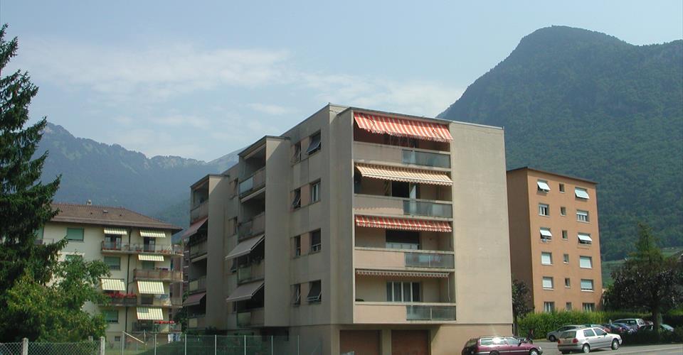 Appartement de 4 pièces au 1er étage comprenant un hall, un séjour, une cuisine agencée, trois chambres à coucher, une salle de bains/wc, un balcon et une cave. Place de parc extérieure en sus à CHF 60.00.