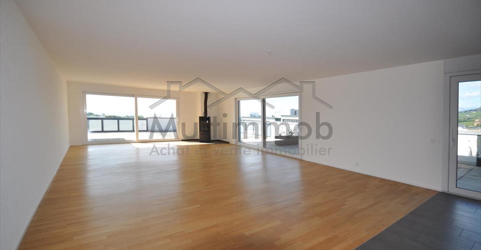 Attique moderne et lumineux avec vue imprenable, à deux pas de toutes les commodités À seulement 300 mètres des transports publics (ligne de bus vers la gare d’Allaman), de l’École Internationale de la Côte, d’un supermarché et à moins de 10 minutes à pied des écoles primaires et secondaires d’Aubonne, ce superbe attique séduit par sa situation idéale et son confort exceptionnel. Offrant une surface habitable de 204 m², prolongée par de vastes terrasses orientées sud et ouest totalisant plus de 170 m², cet appartement de standing bénéficie d’une luminosité remarquable grâce à de grandes baies vitrées et une orientation principalement sud-ouest. Un lieu de vie rare et raffiné, alliant volumes généreux, prestations haut de gamme et vue dégagée sur le lac Léman et les Alpes savoyardes. L’appartement se compose comme suit : – Un vaste hall d’entrée accueillant – Un WC visiteurs équipé d’une colonne lave-linge/sèche-linge – Une superbe cuisine contemporaine, entièrement équipée avec un réfrigérateur américain et un îlot central, ouverte sur un immense séjour de 100 m² – Un salon chaleureux avec poêle à bois et accès direct aux terrasses – Une suite parentale d’exception de plus de 40 m² comprenant une grande chambre avec accès terrasse, un vaste espace bureau ou fitness, un dressing et une salle de bains privative avec baignoire et douche – Deux autres chambres confortables partageant une salle de douche moderne – Une grande cave en complément L’extérieur, quant à lui, invite à la détente grâce à ses spacieuses terrasses offrant un ensoleillement optimal et une vue imprenable sur les paysages environnants. En parfait état et disponible rapidement, ce bien ne nécessite aucun travaux. Idéal pour les amateurs de grands espaces et de luminosité naturelle. Trois places de parc extérieures sont disponibles en supplément au prix de CHF 20’000.- par place. La gare d’Allaman, située à moins de 5 minutes en voiture ou en bus, permet de rejoindre Lausanne ou Genève environ toutes les 30 minutes. La région offre également un accès facile aux centres commerciaux d’Etoy et de la Côte, rendant le quotidien encore plus pratique.