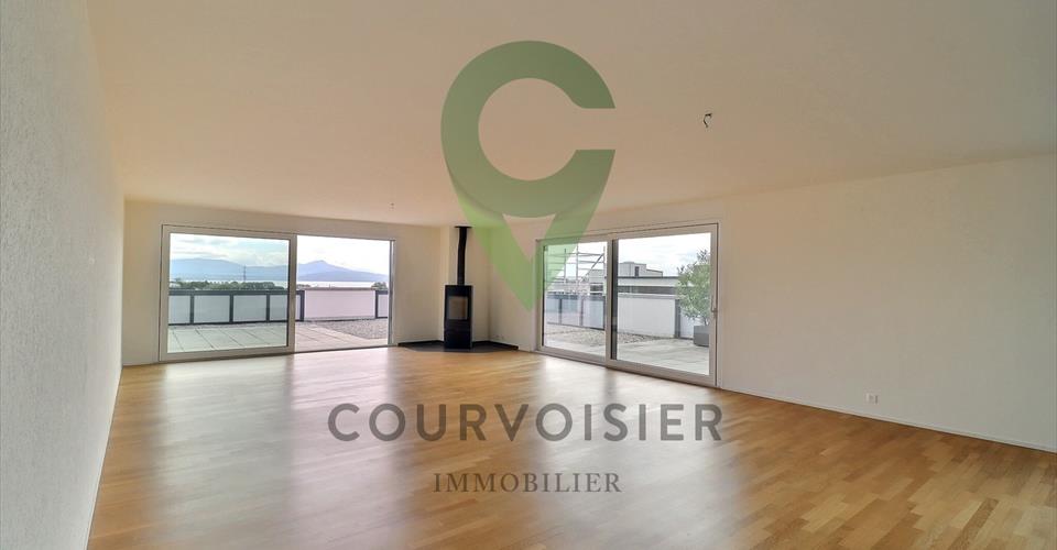 Vue lac & volumes d’exception – Attique contemporain à Aubonne à moins de 6’000.– fr/m2 Avec ses lignes architecturales épurées, son immense terrasse plein sud et sa vue panoramique imprenable sur le lac Léman, les Alpes et le Jura, cet attique de 204 m² habitables incarne une certaine idée du confort moderne. Situé à Aubonne, au cœur de la zone économique et à quelques minutes des écoles, commerces et axes autoroutiers, ce bien unique offre un cadre de vie rare, entre modernité et fonctionnalité. A 2 pas de l’école Internationale d’Aubonne. Libre de suite, il conviendra aussi bien à une famille souhaitant s’y installer qu’à un couple en quête d’un bien lumineux, spacieux et sans compromis. La distribution intérieure est harmonieuse, fluide et parfaitement adaptée à un quotidien confortable : Hall d’entrée d’environ 6 m², sobre et élégant, avec espace vestiaire Pièce de vie de près de 100 m², baignée de lumière naturelle, regroupant : Salon chaleureux aux lignes épurées Salle à manger ouverte sur l’extérieur Cuisine contemporaine avec îlot central et électroménager haut de gamme Accès direct à la terrasse depuis tout l’espace jour, grâce à de larges baies vitrées plein sud Une terrasse spectaculaire, un panorama saisissant Véritable prolongement du séjour, la terrasse de 172 m² orientée sud-ouest s’impose comme un élément central de ce bien. Elle invite à la détente, aux repas en extérieur et aux soirées face au Lac Léman et au massif alpin, dans une atmosphère paisible et privilégiée. Côté nuit, l’appartement offre une séparation claire entre intimité et vie de jour : Suite parentale de 43 m², composée de : Chambre généreuse avec coin salon ou espace fitness Dressing intégré Salle d’eau privative élégante avec douche à l’italienne et baignoire. Deux chambres secondaires de belles dimensions : L’une d’environ 14 m², l’autre d’environ 12 m² Deuxième salle de bains, avec baignoire WC visiteurs à proximité de l’entrée Prestations complémentaires Trois places de stationnement extérieures (CHF 20’000.–/unité, en sus) à proximité immédiate Finitions haut de gamme, aucun travaux à prévoir Immeuble bien entretenu et récent Ce bien séduira les amateurs de grands volumes, de terrasses spectaculaires et de vues dégagées, tout en recherchant une adresse centrale, à mi-chemin entre Genève et Lausanne. Un appartement coup de cœur, prêt à accueillir ses nouveaux propriétaires dans un confort absolu. Contactez-nous pour recevoir le dossier complet en avant-première ou organiser une visite personnalisée.