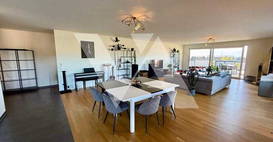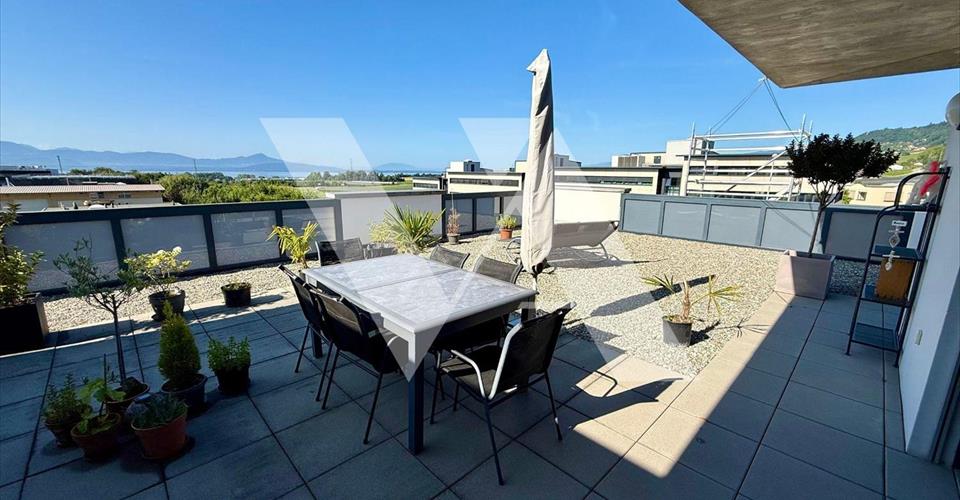 Cet élégant appartement de 5.5 pièces, d’une surface habitable de 204 m², séduit par son agencement fluide, ses volumes généreux et sa luminosité exceptionnelle. Il s’ouvre sur une vaste terrasse orientée plein sud de 172 m², véritable prolongement de l’espace de vie, offrant une vue imprenable sur le lac et les Alpes. Des prestations de qualité pour un confort optimal Réalisé avec des matériaux contemporains et des finitions soignées, l’appartement répond aux standards PPE les plus exigeants. Chaque espace a été pensé pour allier confort, esthétisme et fonctionnalité. Un cadre de vie recherché Situé dans un quartier résidentiel calme, à proximité immédiate des écoles, des commerces et des transports publics, ce bien allie tranquillité et accessibilité. La distribution se compose comme suit : – Spacieuse entrée – WC visiteurs avec colonne lave-linge/sèche-linge – Cuisine ouverte entièrement équipée avec îlot central – Séjour lumineux agrémenté d’un poêle, prolongé vers l’extérieur par de grandes baies vitrées – Deux chambres avec leur salle de bains/WC – Suite parentale avec deux chambres, dressing et salle de bains/douche/WC – Terrasse de 172 m² Informations complémentaires : – Vendu avec une cave, un réduit et 3 places de parc extérieures (CHF 20’000.-/unité, en sus) ; – Actuellement loué CHF 3’500.-/mois + CHF 300.- de charges forfaitaires ; – Le bail en cours prend fin le 31 juillet 2025. Une opportunité rare à ne pas manquer ! Contactez-nous dès aujourd’hui pour plus d’informations ou pour organiser une visite.