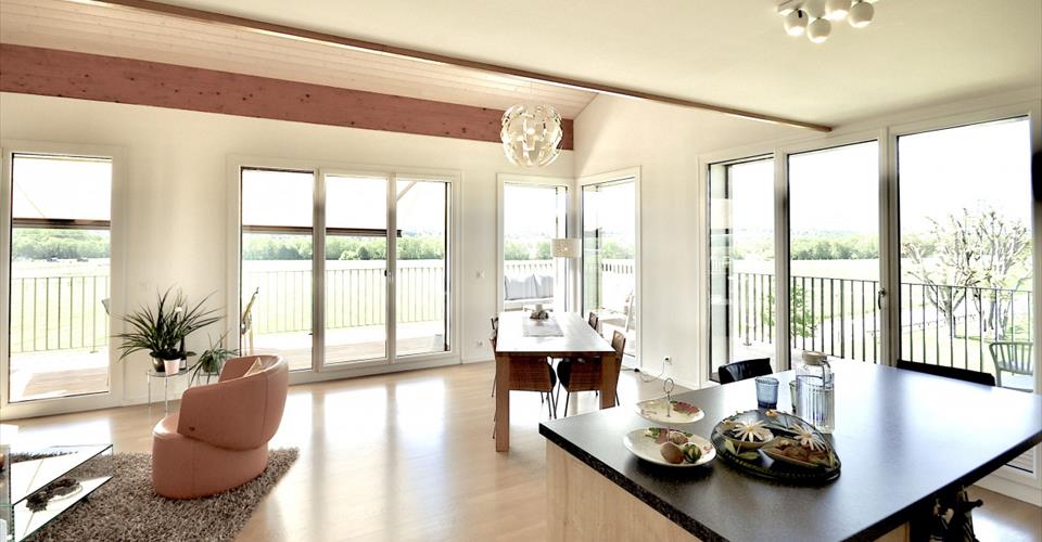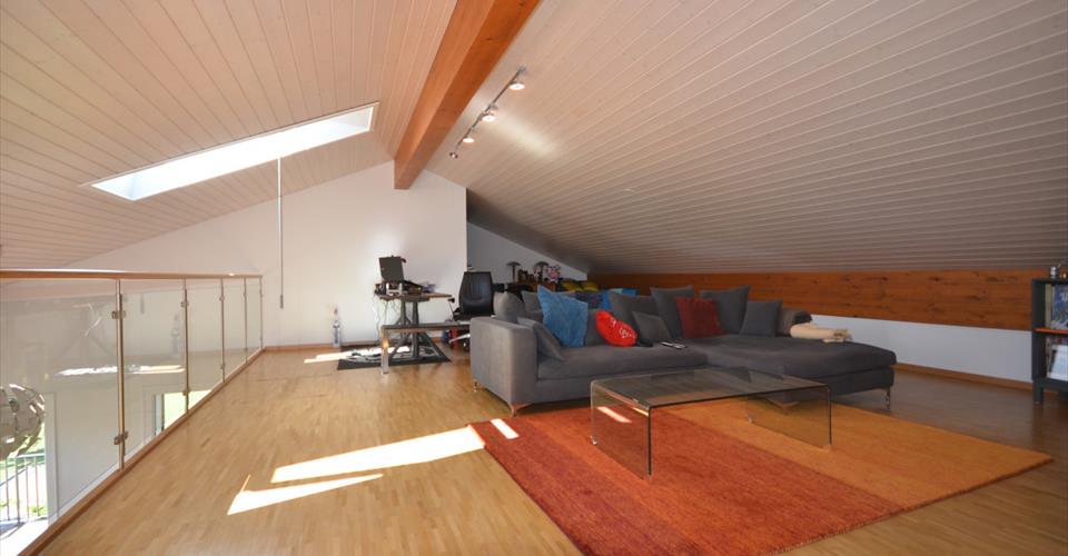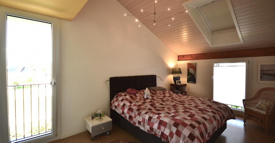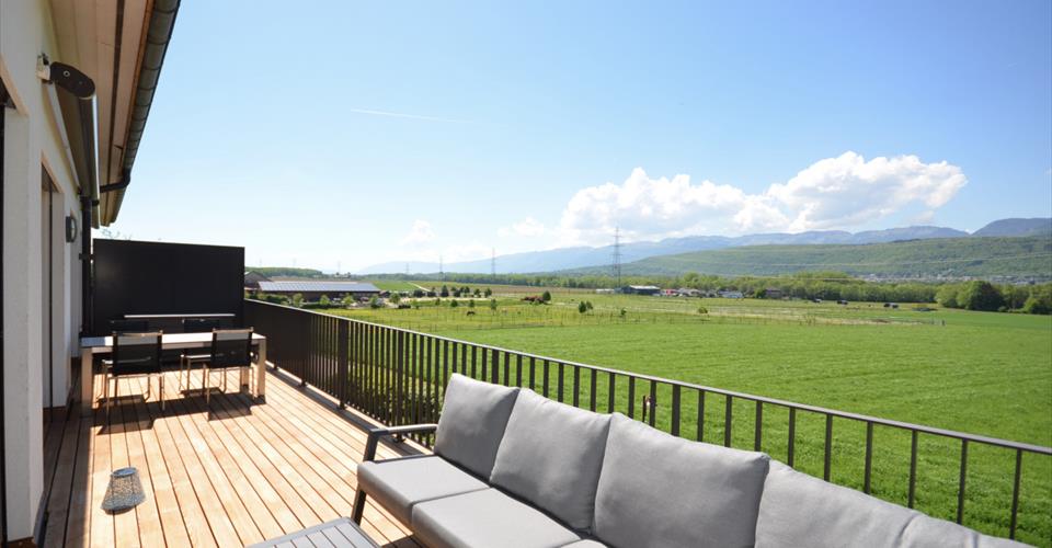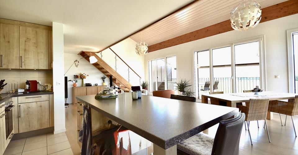 Découvrez un bien unique où raffinement et volumes généreux s’assemblent pour offrir un cadre de vie privilégié. Un espace de vie lumineux à l’architecture ouverte. L’appartement séduit d’emblée par son vaste séjour baigné de lumière naturelle, sublimé par de larges baies vitrées toute hauteur orientées principalement à l’ouest et au sud. Cette pièce maîtresse, avec ses 49 m² de convivialité, bénéficie d’une hauteur sous plafond remarquable et d’une ambiance chaleureuse grâce à l’alliance du bois clair, du métal et du verre. Le design des escaliers et la mezzanine ouverte créent une dimension d’espace rare et une circulation harmonieuse entre les différents volumes. L’intégration d’une cuisine moderne entièrement équipée, ouverte sur le séjour et la salle à manger, accentue la convivialité et la flexibilité d’usage. Une grande terrasse pour profiter de la vue. La terrasse de 42 m² s’impose comme une véritable extension du séjour. Elle offre un panorama sans vis-à-vis sur les champs et la chaîne du Jura, dévoilant une perspective et un environnement verdoyant, à la fois paisible et ouvert. L’espace atypique se prête aussi bien à la détente qu’aux repas en extérieur, prolongé par des protections de toiture généreuses. La mezzanine de 52 m² est un atout rare. Aménagée sous combles, elle offre une grande liberté d’usage : surface pour le télétravail bénéficiant de la lumière naturelle, espace détente avec vues sur le séjour, salle de jeux, espace de rangement ou home cinéma. La hauteur variable sous plafond donne un cachet de cocon tout en conservant une ouverture sur la pièce de vie. Des espaces de nuit optimisés et bien séparés, garantissant intimité et confort. La suite parentale (17 m²) offre de beaux volumes, accompagnée d’une salle de bains privative. Les chambres secondaires (12 m² chacune) sont lumineuses et faciles à aménager. Un WC visiteurs ainsi qu’une salle de douche/WC supplémentaire viennent compléter l’ensemble. Implanté dans un immeuble récent de seulement 3 étages et 2 appartements par niveau, le bien bénéficie : – d’un chauffage à pellets, associé à un chauffage au sol performant, – d’une cave privative de 17 m² et d’un local privatif fermé de 8 m², – de deux places de parking souterraines dont une équipée d’une borne électrique (en sus 80’000.— y compris borne électrique). Surface habitable pondérée : 127 m2 Surface mezzanine : 52 m2 Surface terrasse : 42 m2 Des parties communes parfaitement aménagées (local à vélos, dépôt, espace scooters) offrent des espaces supplémentaires et sécurités. Vous êtes à la recherche d’un cadre de vie inspirant, baigné de lumière et d’espace. Chaque détail de cet appartement a été pensé pour favoriser le bien-être : matériaux, agencements fonctionnels, luminosité omniprésente. Pour organiser une visite personnalisée ou recevoir un dossier complet, contactez-moi sans attendre!