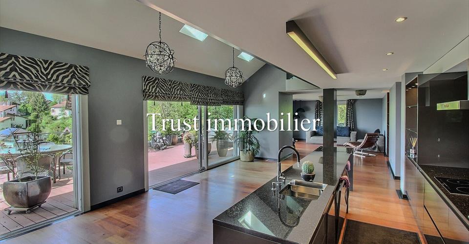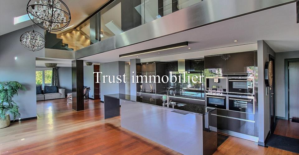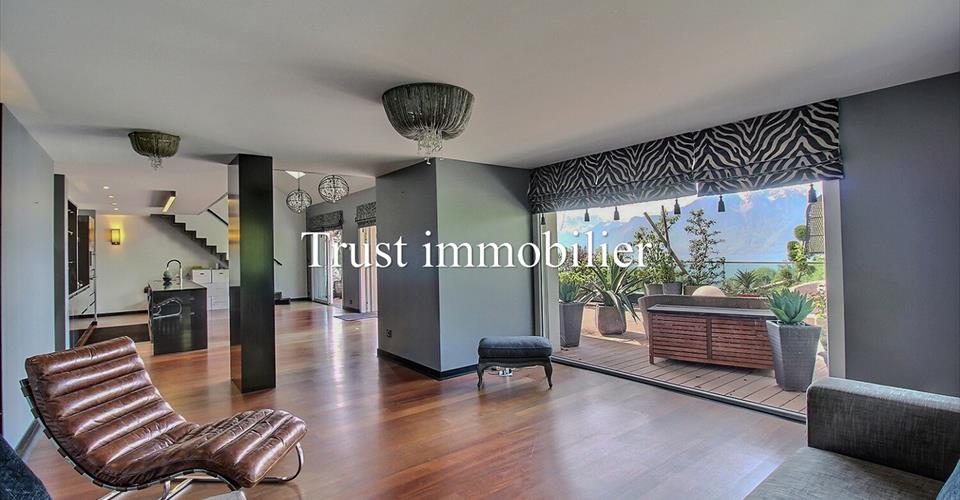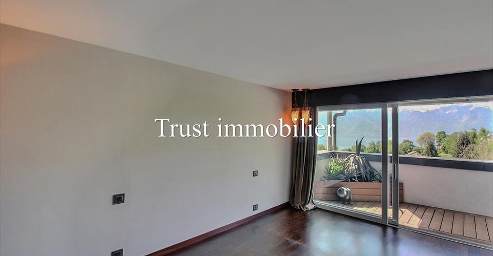 Prestigieux duplex clé en main de 279 m²habitable – Vue imprenable sur lac et montagnes, à 10 min de Vevey Trust Immobilier, agence immobilière à Canton Vaud, Genève et Crans-Montana vous propose Ref. 5058 -TVE.F Découvrez un univers d’élégance et de confort dans ce somptueux duplex conçu avec des finitions haut de gamme et un souci du détail, chaque espace de cet appartement a été pensé pour créer un cadre de vie unique et raffiné. Rez-de-chaussée offre un espace de vie baigné de lumière est composé de : Un vaste séjour lumineux qui s’ouvre sur une terrasse plein sud offrant une vue panoramique spectaculaire sur le lac Léman et les majestueuses montagnes environnantes. Lieu idéale pour savourer des moments de détente inoubliables dans ce cadre idyllique. Suite parentale est véritable havre de paix, dispose d’un dressing sur mesure et d’armoires intégrées pour un rangement optimal. Sa salle de bains privative, dotée d’une douche à l’italienne en cascade, deux lavabos et wc. Un accès privatif au balcon côté sud vous permettra de profiter de la vue en toute intimité. Une deuxième suite, également avec sa salle de douche privative et un accès au balcon côté ouest, offre un espace privilégié pour vos invités. Cuisine d’exception où l’art culinaire rencontre le design. La cuisine, entièrement équipée avec des appareils haut de gamme, a été conçue pour les passionnés de gastronomie. Un économat adjacent, équipé d’un lave-linge, d’un sèche-linge et d’un grand réfrigérateur, optimise la fonctionnalité de cet espace de vie moderne et confortable. Étage avec une chambre et espace bureau ouvert À l’étage, une chambre supplémentaire avec sa propre salle de bains et baignoire vous offre un confort supplémentaire. Un espace bureau sous les combles, aménagé avec des matériaux de qualité et agrémenté d’armoires murales sur mesure, constitue un lieu idéal pour le travail et repos dans un environnement calme et inspirant. Coté confort grâce au chauffage au sol, au triple vitrage assurant une isolation phonique et thermique parfaite. Prestations haut de gamme et commodités exclusives : un ascenseur privatif relie directement l’appartement au parking souterrain, où deux places de parc intérieures, équipées de bornes de recharge, vous attendent. Une grande cave privative vous offre un espace de rangement supplémentaire. Ce duplex d’exception représente une opportunité unique d’acquérir un bien alliant prestige, modernité et un confort de vie incomparable. www.trustimmobilier.ch