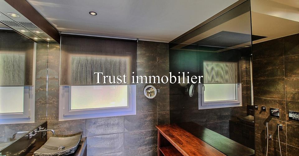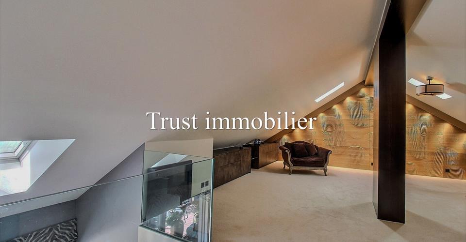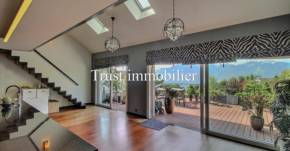 Duplex d’exception avec vue imprenable sur le lac et les montagnes 10 min de Vevey Trust Immobilier, agence immobilière à Canton Vaud, Genève et Crans-Montana vous propose Ref. 5058 -TVE.D Découvrez un univers d’élégance et de confort dans ce somptueux duplex conçu avec des finitions haut de gamme et un souci du détail, chaque espace de cet appartement a été pensé pour créer un cadre de vie unique et raffiné. Rez-de-chaussée offre un espace de vie baigné de lumière est composé de : Un vaste séjour lumineux qui s’ouvre sur une terrasse plein sud offrant une vue panoramique spectaculaire sur le lac Léman et les majestueuses montagnes environnantes. Lieu idéale pour savourer des moments de détente inoubliables dans ce cadre idyllique. Suite parentale est véritable havre de paix, dispose d’un dressing sur mesure et d’armoires intégrées pour un rangement optimal. Sa salle de bains privative, dotée d’une douche à l’italienne en cascade, deux lavabos et wc. Un accès privatif au balcon côté sud vous permettra de profiter de la vue en toute intimité. Une deuxième suite, également avec sa salle de douche privative et un accès au balcon côté ouest, offre un espace privilégié pour vos invités. Cuisine d’exception où l’art culinaire rencontre le design. La cuisine, entièrement équipée avec des appareils haut de gamme, a été conçue pour les passionnés de gastronomie. Un économat adjacent, équipé d’un lave-linge, d’un sèche-linge et d’un grand réfrigérateur, optimise la fonctionnalité de cet espace de vie moderne et confortable. Étage avec une chambre et espace bureau ouvert À l’étage, une chambre supplémentaire avec sa propre salle de bains et baignoire vous offre un confort supplémentaire. Un espace bureau sous les combles, aménagé avec des matériaux de qualité et agrémenté d’armoires murales sur mesure, constitue un lieu idéal pour le travail et repos dans un environnement calme et inspirant. Coté confort grâce au chauffage au sol, au triple vitrage assurant une isolation phonique et thermique parfaite. Prestations haut de gamme et commodités exclusives : un ascenseur privatif relie directement l’appartement au parking souterrain, où deux places de parc intérieures, équipées de bornes de recharge, vous attendent. Une grande cave privative vous offre un espace de rangement supplémentaire. Ce duplex d’exception représente une opportunité unique d’acquérir un bien alliant prestige, modernité et un confort de vie incomparable. www.trustimmobilier.ch