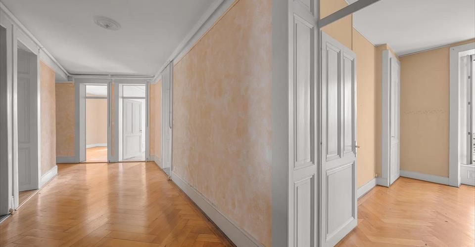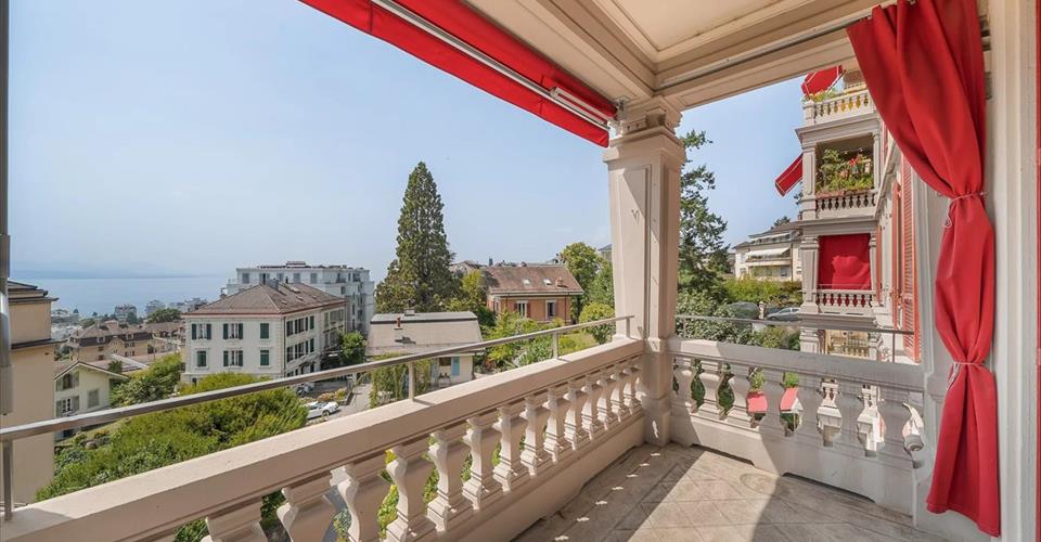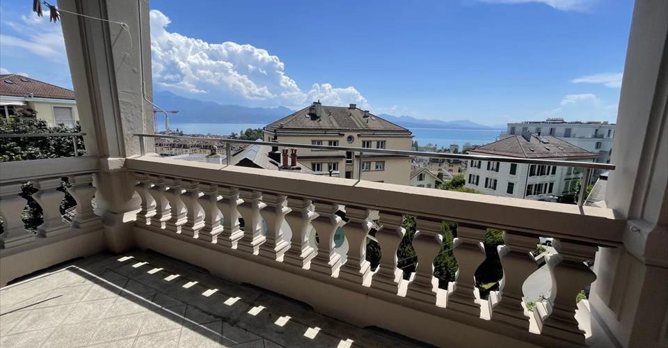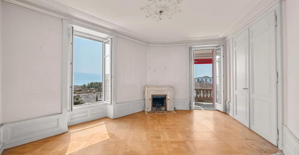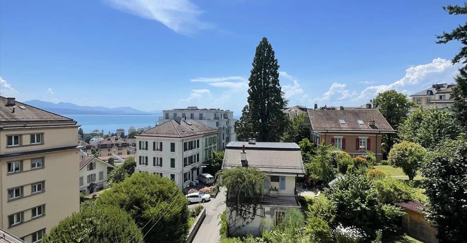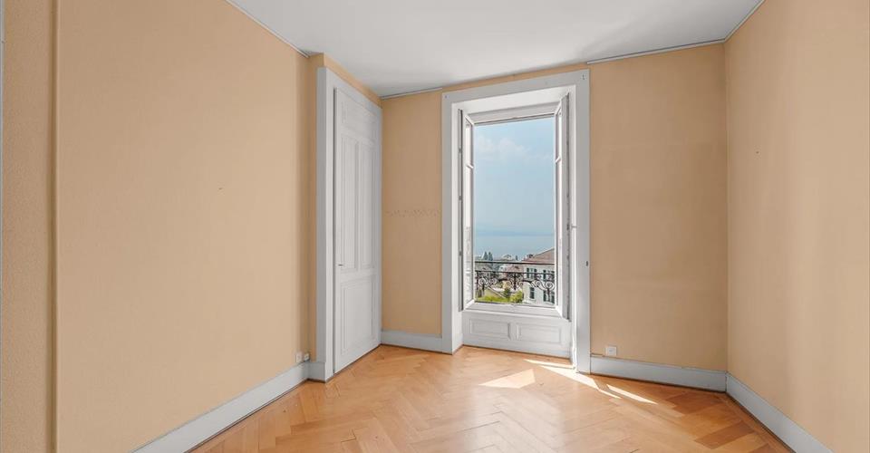 Au centre-ville, proche de toutes les commodités et de la gare CFF, ce magnifique immeuble, érigé en 1902, a été parfaitement entretenu et profite du confort actuel (ascenseur, interphone). Avec une orientation principale Sud-Ouest et profitant d’une hauteur sous plafond à 3,2 mètres, ce magnifique appartement de 5.5 pièces avec balcon dispose de 145 m2 et d’une vue dégagée et partielle sur le lac et les Alpes. Il est composé d’un hall de distribution spacieux, un séjour avec cheminée d’époque, balcon, salle à manger attenante (ou 4ème chambre), 3 chambres, une cuisine agencée (1990) habitable, un réduit (pouvant être modifié en une seconde salle d’eau), une salle de bains (1990), un WC séparé. Chaque pièce dispose d’une armoire murale. Double vitrage isolant et insonorisant sur châssis métal/PVC (1990). Sans nuisance côté chambres et séjour. Bien rare et recherché, ce logement a conservé son charme d’époque avec une cheminée, armoires murales, parquets massifs et moulures d’origine. Quelques travaux de rafraîchissement et/ou mise au goût du jour sont à prévoir. Cave de 8,4 m2 en sous-sol. Parking de Montbenon à 250 mètres. Chaque logement a sa propre chaudière (à gaz) et boiler, la PPE prévoit à moyen terme de se brancher sur le chauffage à distance et ainsi de centraliser la distribution du chauffage et eau chaude.