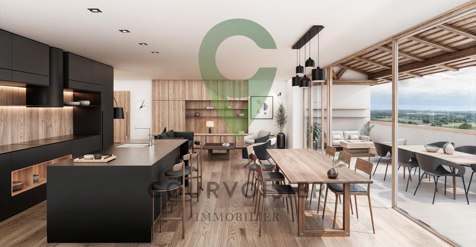 Située au cœur d’un ancien corps de ferme entièrement rénové, cette promotion conjugue avec harmonie le cachet de l’authenticité et le confort du moderne. Nichée dans un environnement préservé, elle offre une vue panoramique imprenable sur le lac et les Alpes, sans aucun vis-à-vis ni risque de construction future. Conçue avec des matériaux de qualité et un souci du détail, cette résidence propose des logements au caractère unique, offrant confort et efficience. D’une superficie de plus de 127 m², ce magnifique appartement situé au premier étage séduit par ses volumes généreux, sa luminosité et son agencement optimisé. Distribution des espaces Un hall d’entrée avec penderie et couloir de distribution Une belle pièce de vie, comprenant un salon, une salle à manger et une cuisine moderne, s’ouvrant sur une terrasse de près de 17m2 permettant de profiter pleinement de la superbe vue panoramique dégagée Quatre chambres spacieuses, dont : Une suite parentale avec salle d’eau privative (douche, WC, lavabo) Une chambre avec accès direct à l’un des deux balcons Une salle de bains (baignoire, WC, lavabo) Un économat/buanderie Atouts et prestations complémentaires Ascenseur Jardin privatif d’env. 165m2, ainsi qu’un magnifique jardin potager de 85m2 Deux places de parc en souterrain (en sus.) Une cave de près de 9m2 Un atelier disponible à la vente (en sus.), offrant un espace indépendant aux multiples possibilités Ce bien d’exception combine sérénité et authenticité, tout en restant à proximité immédiate des commodités. Nous nous tenons à votre disposition pour toute information complémentaire et serions ravis de vous faire découvrir ce bien lors d’une visite.