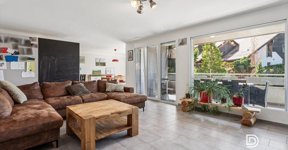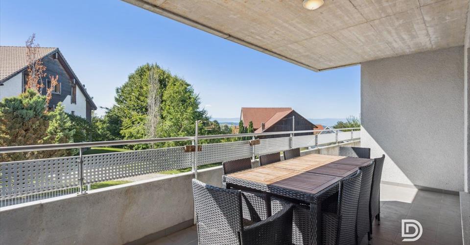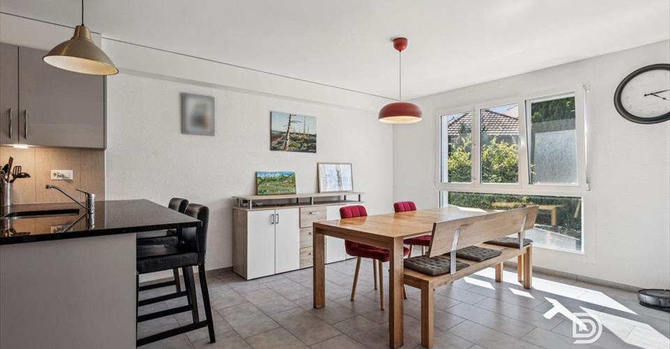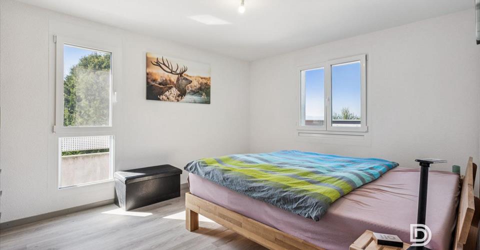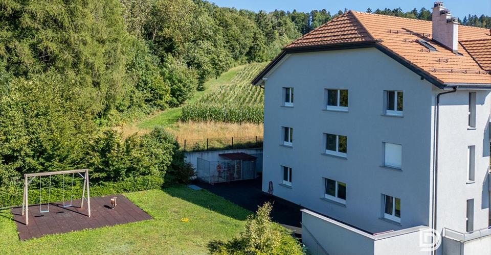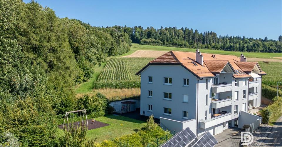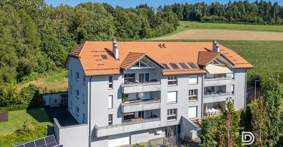 DOSSIER COMPLET SUR DEMANDE Infos en bref: Superficie : 152 m² habitables – balcon de 18 m² – jardin 140 m² Disposition : 5.5 pièces (4 chambres, 2 salles de bains, cuisine ouverte, salle à manger, salon, buanderie) Rangements : couloir avec placards encastrés, grande cave, galetas Stationnement : deux places intérieure, une extérieure (incluses) Orientation : Ouest Environnement : À deux pas de la forêt pour vos promenades Accès aux commodités : Bus à deux pas, Romont, ses commerces et sa gare CFF à 5 minutes. Écologie & économies d’énergie : CECB B-B, PAC géothermique. Espace extérieur : balcon et jardin privatif ———————————————— Bel appartement en rez-supérieur avec jardin privatif à Villars-Bramard Situé dans un environnement calme et verdoyant, cet appartement de 5.5 pièces offre un cadre de vie idéal pour une famille à la recherche d’espace, de confort et de nature. Niché au sein d’une petite PPE récente (2015) bien entretenue, ce logement de 152 m² habitables séduit par ses volumes généreux, sa luminosité naturelle et ses extérieurs soignés. ———————————————— Vous apprécierez particulièrement : Son aspect “clés en main”. Ses grands volumes et nombreuses chambres Sa grande pièce de vie ouverte sur l’extérieur. Ses espace extérieures : jardin et balcon La proximité des transports en commun La proximité de la forêt Son excellent CECB : B-B Romont à seulement 5 minutes