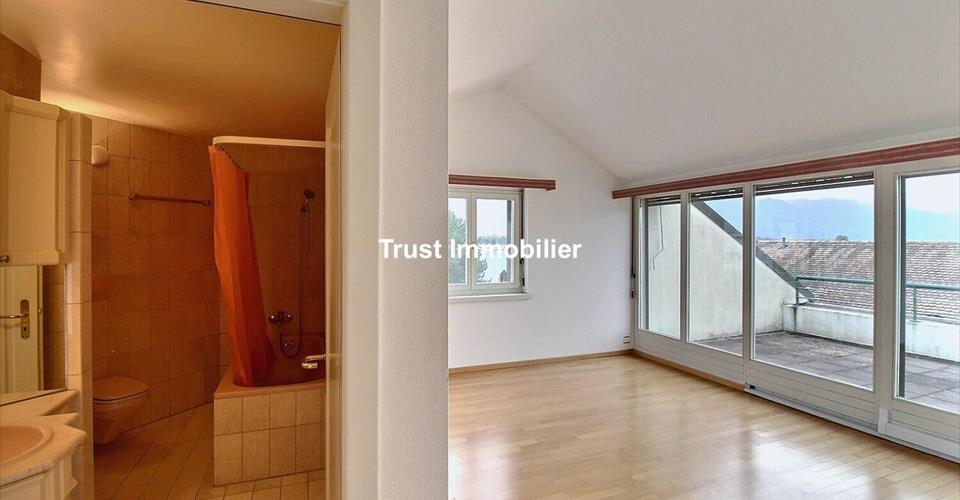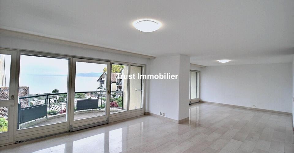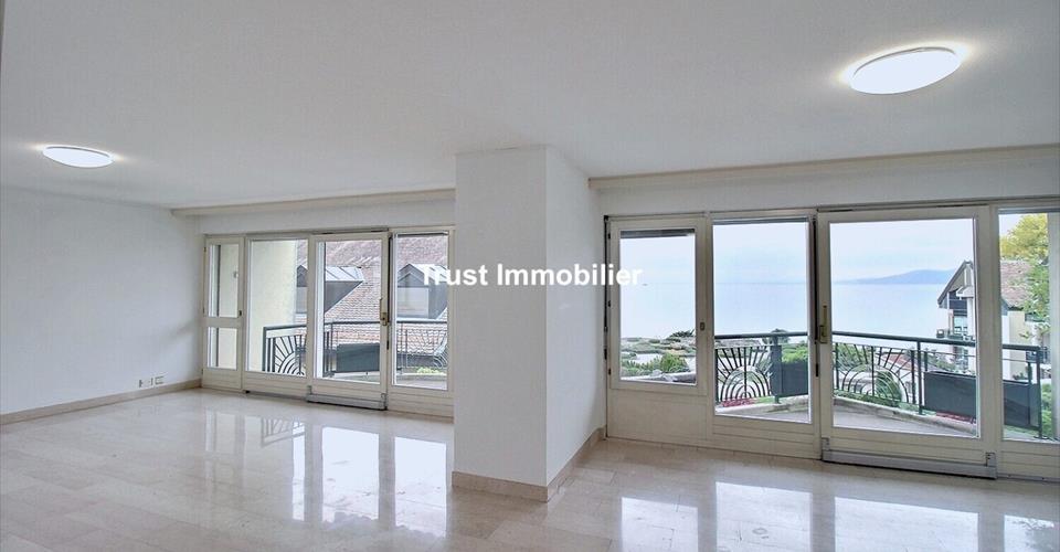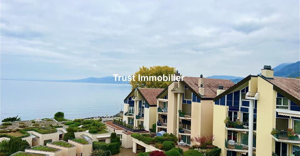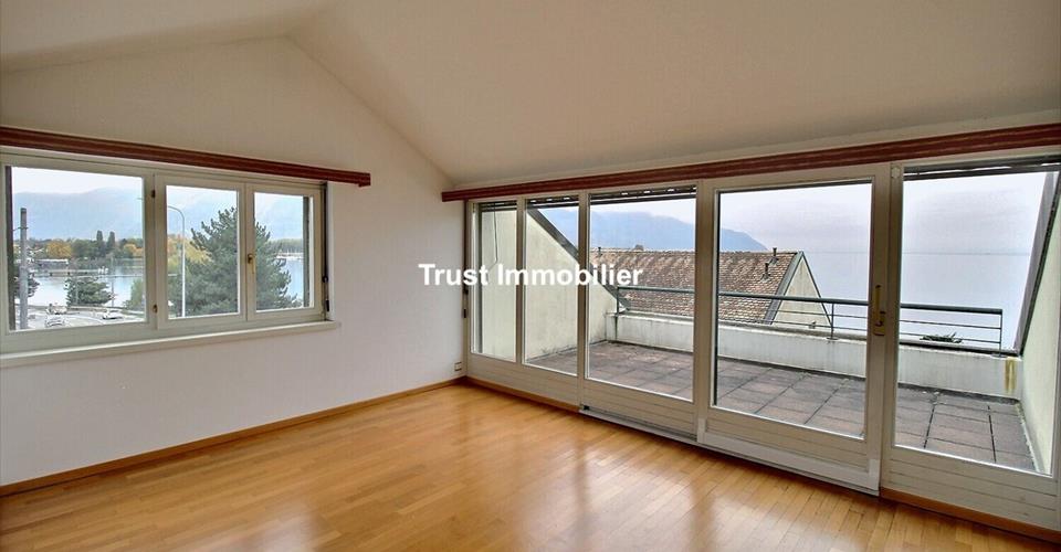 Appartement d’exception en duplex – 5.5 pièces en première ligne du lac à Villeneuve Trust Immobilier, agence immobilière à Canton Vaud, Genève et Crans-Montana vous propose Ref. 6032-TVI Ce splendide appartement en duplex de 5.5 pièces offre environ 172 m² habitables et bénéficie d’un emplacement unique en première ligne du Lac Léman, avec une vue panoramique imprenable sur le lac et les montagnes environnantes. L’appartement fait partie d’une résidence privée et sécurisée. Situé au dernier étage d’une résidence de standing, ce bien en attique se distingue par son caractère exclusif offre un espace de vie généreux. Distribution intérieure Premier étage : Vaste et lumineux salon avec accès aux terrasses Cuisine équipée Chambre à coucher WC visiteurs ainsi qu’une salle de douche. Deuxième étage : Suite parentale avec salle de bains privative et balcon Deux chambres à coucher avec armoires encastrées Salle de bain Couloir avec armoires intégrées Deux places de parc intérieures (CHF 80’000.- en sus) complètent ce bien d’exception. La résidence bénéficie d’un emplacement exceptionnel en première ligne du lac, tout en étant à proximité immédiate de toutes les commodités : supermarché, poste, pharmacie, et transports publics. Elle se trouve à l’entrée de Villeneuve, directement sur les quais, à quelques pas du centre : Arrêt de bus à 100 mètres Gare CFF à environ 300 mètres Accès rapide à Montreux, Lausanne et au Valais Points forts: Emplacement en bord de lac, accès à l’eau Vue panoramique sur le lac et les Alpes Dernier étage, en attique Résidence fermée et sécurisée Trois balcons Orientation sud-ouest, très lumineux Vente autorisée aux étrangers non résidents traduire en anglais et en russe www.trustimmobilier.ch