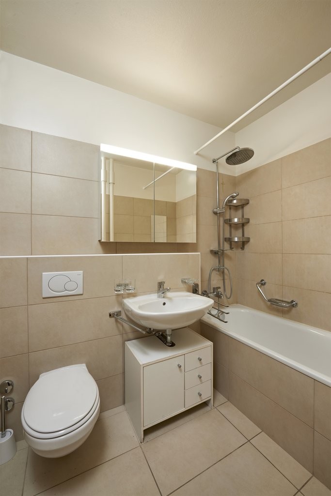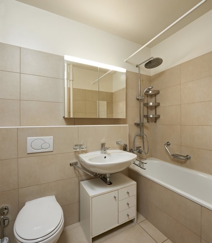 – Une salle de bains avec baignoire et WC