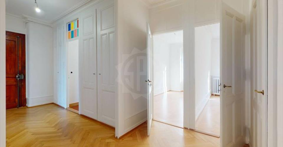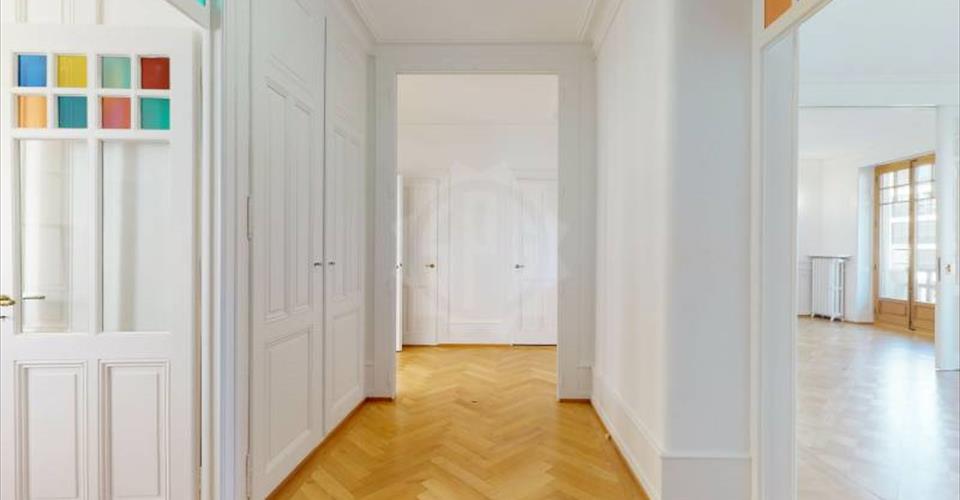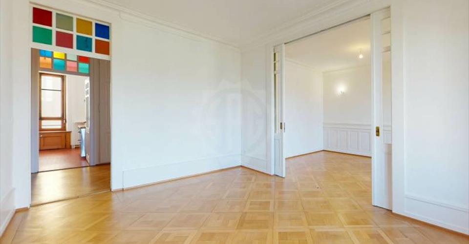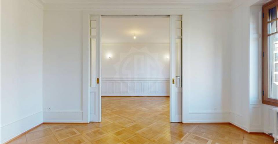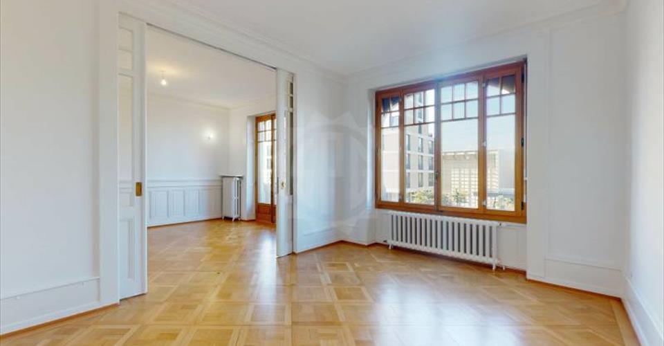 – Vue dégagée – Disponible rapidement Magnifique appartement de 5.5 pièces d’environ 123m2 PPE situé au 2ème étage d’une belle copropriété en plein cœur des Eaux-Vives. Ce bien rénové est disposé comme suit : – Hall d’entrée avec armoires murales – WC visiteurs – Cuisine fermée entièrement agencée et équipée (frigo américain, four, plaque de cuisson vitrocéramique, hotte, branchement pour machine à laver le linge) – Double salon en enfilade avec une armoire murale, accès balcon – Deux chambres à coucher avec armoire murale – Salle de bains / double vasque / WC Une cave complète ce bien d’exception à la localisation idéale. LOYER : CHF 4’650.00 CHARGES : CHF 250.00 DISPONIBILITE : 01.08.2025