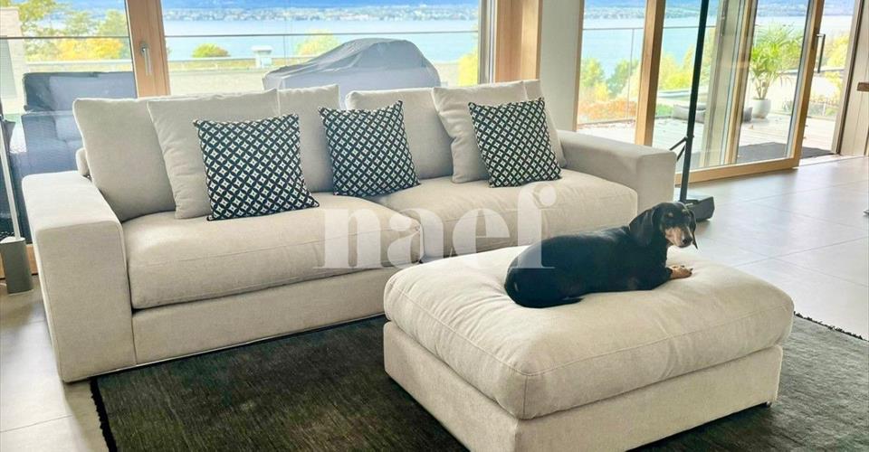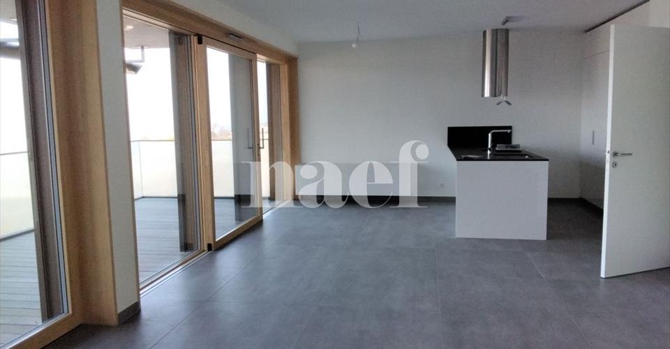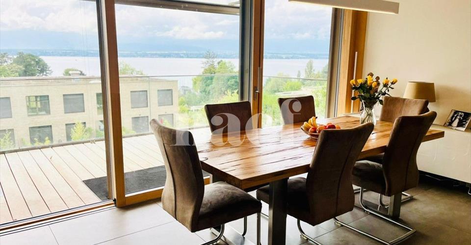 Superbe vue lac – généreux balcon et grande terrasse privative Situé sur la Commune d’Hermance, à l’entrée du charmant village et dans une belle copropriété constituée de maisons et de petits immeubles, nous proposons un bel appartement de 6 pièces au rez-de-chaussée supérieur. Construit selon les dernières normes HPE, avec des matériaux de qualité et des finitions soignées, le bâtiment est chauffé par des pompes à chaleur et il dispose du système de « Géocooling » permettant de rafraichir leslogements durant la belle saison. Situé en dernière ligne, l’immeuble est à l’abri des nuisances, et bénéficied’un très bon ensoleillement. Traversant et lumineux, l’appartement totalise une surface habitable d’environ 122,4 m², à laquelle s’ajoute un généreux balcon de 28 m² offrant une vue panoramique sur le lac et une terrasse privative de 53 m², donnant sur la campagne environnante. Le hall d’entrée dispose d’un visiophone et d’armoires intégrées. Il s’ouvre sur la pièce de vie qui comprend,une cuisine avec un îlot, entièrement agencée et équipée, un espace salle à manger et un agréable séjour. Une pièce polyvalente pouvant servir de bureau ou de salon/TV est attenante à la pièce de vie et le tout offre unaccès direct au spacieux balcon. La partie nuit comprend un WC visiteurs, une armoire abritant un lave-linge et un sèche-linge, une suiteparentale avec dressing et salle de bains/WC attenante, deux chambres à coucher coucher avec armoiresintégrées, ainsi qu’une salle de douche à l’italienne avec WC, double vasque et sous-meuble. A noter quetoutes les chambres disposent d’un accès directe à la terrasse privative. L’ensemble des pièces dispose du chauffage au sol, de stores électriques à lamelles orientables et de grandes fenêtres en triple vitrage. Deux places de parc intérieures à CHF 150.-/mois chacune, en sus du loyer, sont liées à l’appartement et disposent d’une borne électrique. Une spacieuse cave laissée à titre gratuit et à bienplaire est accessible par le sous-sol de l’immeuble adjacent.