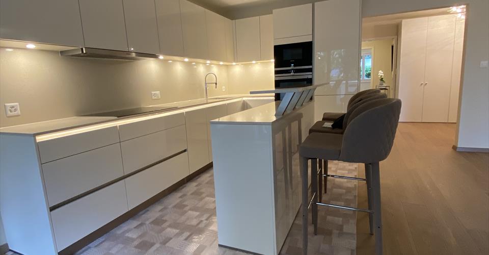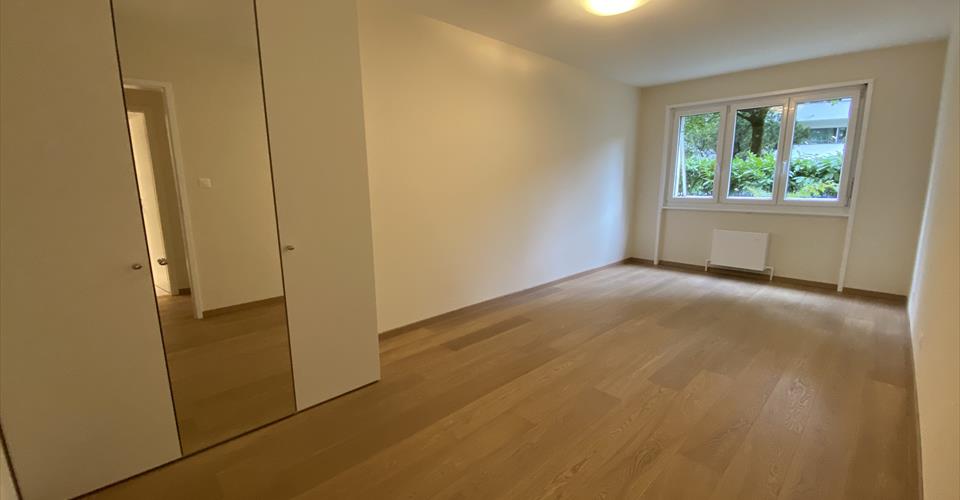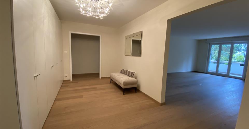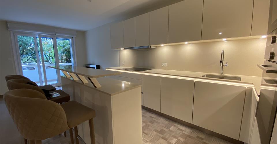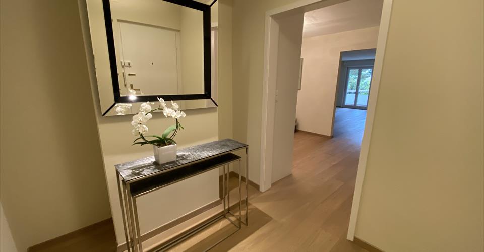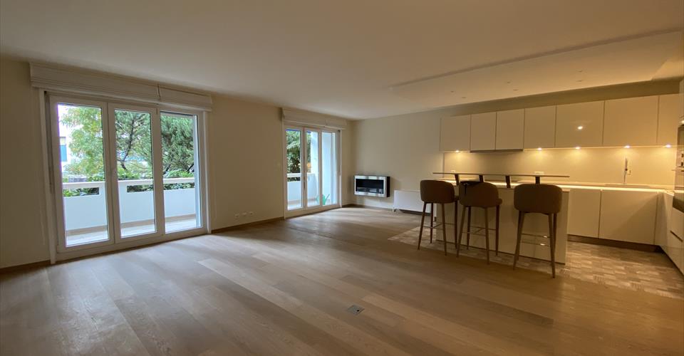 Situé dans le quartier de Chailly calme et verdoyant, ce bel appartement de 5 1/2 pièces bénéficie d’un accès rapide à toutes les commodités, aux axes autoroutiers ainsi qu’aux transports publics; un arrêt de bus se trouve au pied de l’immeuble voisin. L’appartement entièrement refait à neuf est au rez-de-chaussée de l’immeuble datant des années 1980. Il jouit de finitions haut de gamme et est disposé de : – hall d’entrée – grand hall avec armoires murales – cuisine ouverte entièrement équipée avec ilôt central – séjour avec cheminée éthanol et accès au grand balcon – chambre parentale avec armoire et salle de bains et douche à l’italienne attenante, double vasque, wc – 2 chambres à coucher avec armoires – petite chambre à coucher – salle de douche, double vasque, wc – wc visiteurs – lave-linge et sèche-linge dans pièce séparée – balcon avec peu de vis-à-vis – cave Pas de place de parc. Toutefois des places communales avec macaron sont disponibles dans la rue.