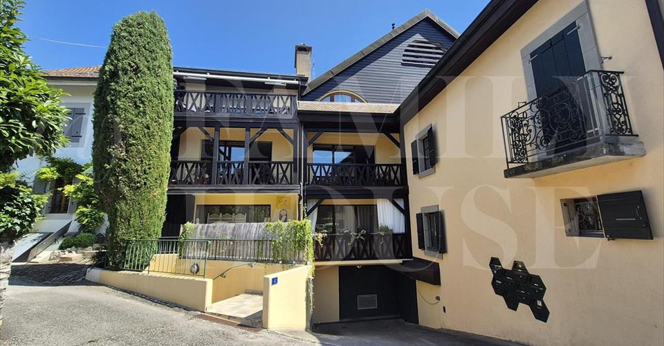 Ce très bel objet est situé dans une ancienne bâtisse, située au coeur du hameau de Villette. Ledit lieu fait partie de la commune de Thônex, dont les biens en vente sont rares et très recherchés. Cet appartement bénéficie en outre d’un environnement calme et verdoyant, aux portes de la ville. Les transports publics se trouvent à quelques mètres seulement et mènent directement au centre de Genève. En très bon état et régulièrement entretenu, ce 4.5 pièces dispose de 103 m2 PPE et d’une véranda chauffée de 22 m2. L’ensemble se compose comme suit: – Hall d’entrée / véranda chauffée et habitable de 22 m2 –> Actuellement aménagée en véranda avec armoires et chambrette – WC visiteurs – Cuisine entièrement équipée avec espace repas –> emplacement lave-linge/sèche-linge – Séjour avec cheminée fonctionnelle et accès à la véranda chauffée – 2 chambres à coucher avec armoires encastrées – Salle de bains complète (baignoire & lavabo & WC & bidet) Une cave, deux réduits ainsi qu’une place de parking intérieure complète le tout.