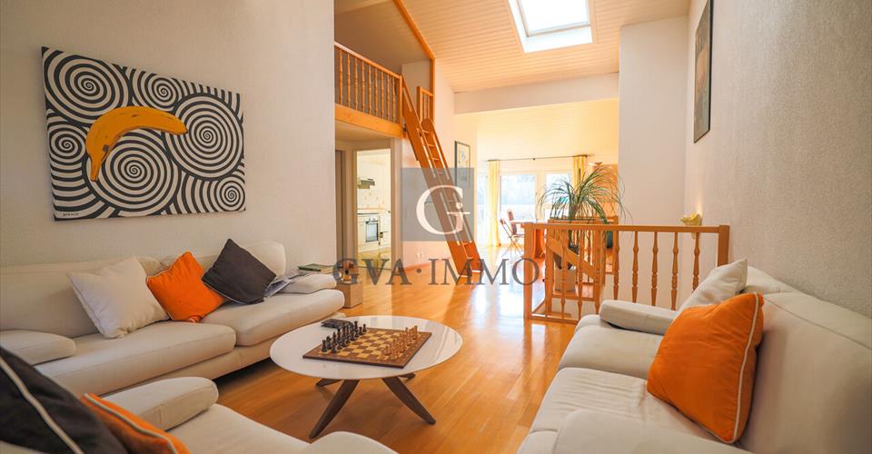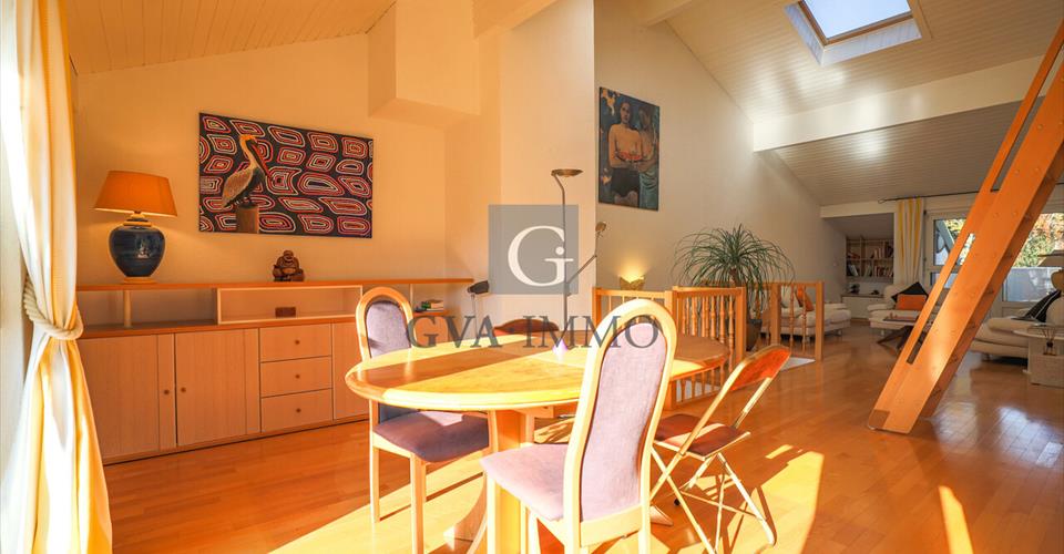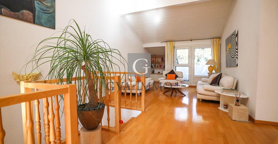 Superbe duplex situé dans une résidence prisée de Chêne-Bougeries, offrant un cadre de vie calme et verdoyant au cœur d’un magnifique parc arboré. Proche des transports en commun, il permet un accès rapide et facile au centre-ville de Genève. L’appartement dispose d’une surface PPE de 133 m², complétée par une mezzanine de 9 m² et trois terrasses totalisant 27 m², soit une surface pondérée de 155,5 m². À l’étage supérieur, une pièce de vie traversante baignée de lumière offre une superbe hauteur sous plafond et regroupe un salon, une salle à manger et une cuisine moderne. Une mezzanine, idéale pour un bureau, ainsi qu’une chambre avec salle de douche attenante et deux terrasses spacieuses viennent compléter ce niveau. Le niveau inférieur accueille l’entrée principale de l’appartement, deux chambres lumineuses avec accès à une terrasse orientée plein sud, ainsi qu’une salle de bain familiale. Pour votre confort, le bien comprend également un garage double fermé, une place de parking extérieure et une cave en sous-sol. Idéalement situé dans un environnement paisible, tout en restant proche des commodités et du centre-ville, ce duplex est une opportunité rare à découvrir sans tarder.