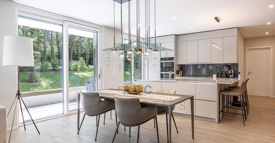 Situé au sein d’une prestigieuse résidence neuve et sécurisée, nichée dans un écrin de verdure de plus de 7’000m², ce superbe appartement allie élégance contemporaine, calme absolu et proximité immédiate avec les commodités du village de Vésenaz. Construit avec des matériaux haut de gamme, il séduit par ses volumes généreux, magnifiée par de larges baies vitrées. D’une surface de 176m² pondérés, il se compose de : – Une cuisine ouverte sur la salle à manger et le salon, avec de très belles finitions Rimadesio – Une magnifique terrasse de 58m² – Une suite parentale avec salle de douche attenante – Deux chambres supplémentaires – Une salle de bains – Un toilette visiteurs – Une buanderie – Une cave – Un double box fermé de 37m² Un bien rare et raffiné, offrant un art de vivre privilégié aux portes de Genève. Contactez-nous pour plus d’informations et pour organiser une visite privée. Located within a prestigious, newly built and secure residence nestled in over 7,000sqm of greenery, this superb apartment combines contemporary elegance, absolute tranquillity, and immediate proximity to the amenities of Vésenaz village. Built with high-end materials, it impresses with its generous volumes and exceptional natural light, enhanced by large bay windows. With a weighted surface area of 176sqm, the apartment is composed of: – An open-plan kitchen, dining area and living room with exquisite Rimadesio finishes – A stunning 58sqm south-facing terrace – A master suite with en-suite shower room – Two additional bedrooms – A bathroom – A guest toilet – A laundry room – A cellar – A closed double garage (37sqm) A rare and refined property offering a privileged lifestyle just minutes from the heart of Geneva. Contact us for more information and to schedule a private viewing.