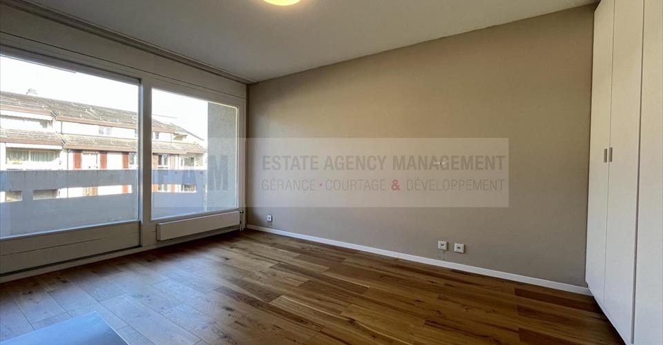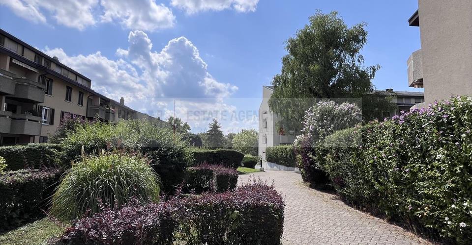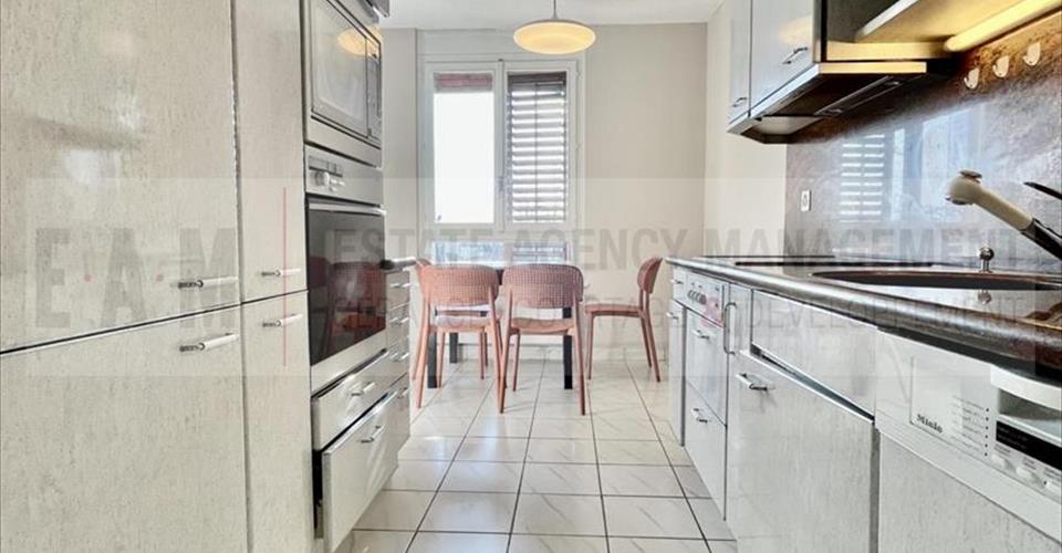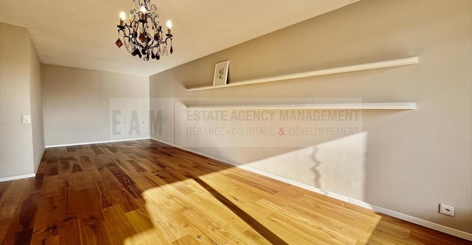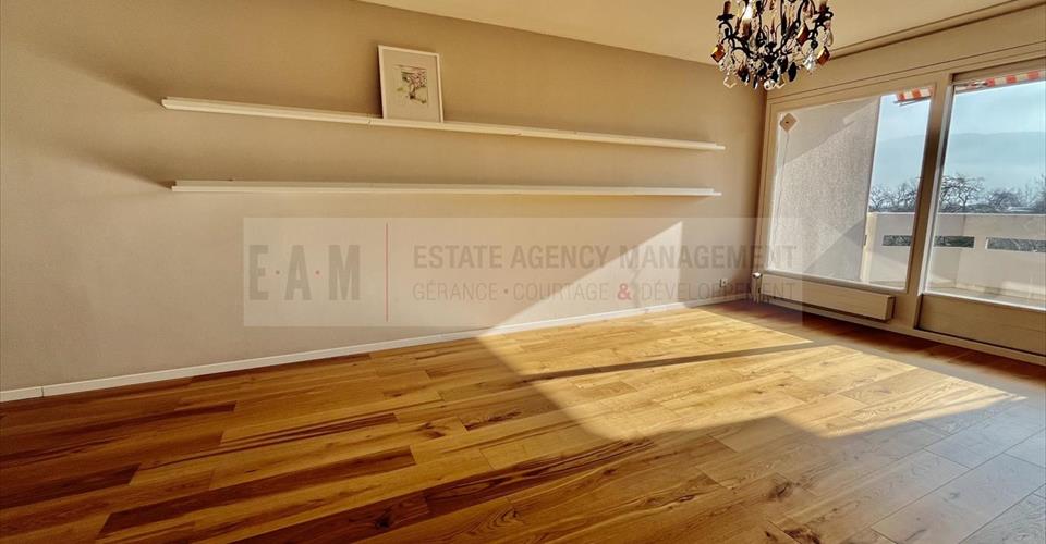 ENGLISH BELOW EAM SA a le plaisir d’offrir en exclusivité ce charmant appartement de 5P traversant au coeur de la copropriété de la Résidence de La Planta à Cologny. Bénéficiant d’environ 131m2 en PPE, l’appartement se distribue comme suit: – Entrée et dégagement – Spacieux salon et salle à manger donnant accès au premier balcon avec vue sur le Salève – Cuisine fermée et équipée donnant également accès au balcon côté jour – Trois chambres à coucher dont une donnant accès au second balcon de l’appartement – Dégagement avec armoires – WC visiteurs – Salle de douche complète avec colonne de lave-linge/sèche-linge Immeuble sans ascenseur. Une place de parking en sus (CHF 50’000.- ) ainsi qu’une cave complètent ce bien. EAM SA is pleased to offer this 5P apartment for sale in the heart of the Residence La Planta in Cologny. Spread over 131 sq.m. including the two balconies the apartment features the following layout: – Entrance – Spacious living and dining room with access to the first balcony with view over the Saleve – Closed and equipped kitchen that also offers access to the first balcony – Three bedrooms including one with access to the second balcony of the apartment – Powder room – Complete shower room with washer and dryer corner – Corridor with built-in wardrobes No elevator. One parking space (CHF 50’000.-) and one cellar complete this property