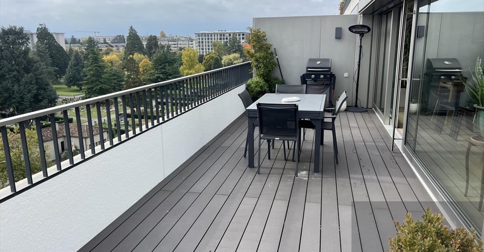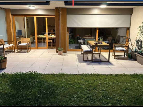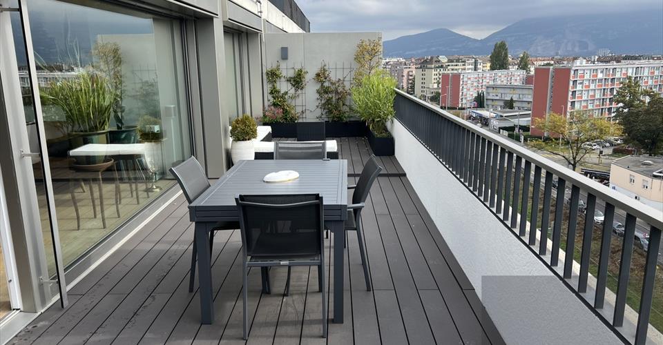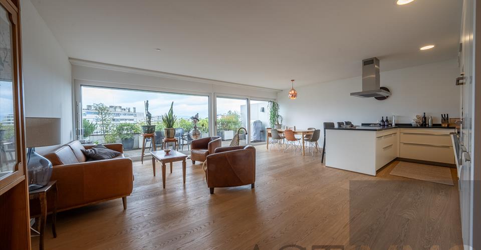 Idéalement situé sur la rive droite, proche du centre-ville de Genève, de toutes les commodités telles que commerces, écoles, restaurants, à dix minutes de la gare de Cornavin et de l’aéroport de Cointrin, très bel appartement traversant de 5 pièces au 8ième étage d’un immeuble récent répondant à tous les critères de confort et de hautes performances énergétiques. Une terrasse orientée sud-ouest de 33 m2 avec une belle vue dégagée sur une partie de la ville et le Salève agrémente cet appartement. Son exposition lui confère une belle luminosité. Une résidence d’exception aux prestations haut de gamme: Vivre dans cette copropriété, c’est choisir un art de vivre unique, au cœur d’un environnement privilégié mêlant confort, bien-être et raffinement. Des espaces communs pensés pour votre plaisir et votre détente : Les résidents bénéficient d’équipements rares et exclusifs, à commencer par un carnotzet, véritable cave à vin climatisée, idéale pour partager des moments conviviaux entre amis autour de grands crus. Une salle de fitness moderne, agrémentée d’un espace spa complet — avec hammam, jacuzzi, douche sensorielle et vestiaires privatifs — vous invite à la détente et à la régénération au quotidien, sans quitter votre domicile. Un service de conciergerie discret et efficace: Est également à votre disposition à temps partiel, ajoutant une touche de confort et de sécurité supplémentaire à votre quotidien. Ce service, combiné aux prestations premium de la résidence vous garantit un cadre de vie serein. Les 133 m2 de l’appartement se distribue comme suit : pour la partie jour, un hall d’entré duquel on accède sur un spacieux séjour avec sa belle et fonctionnelle cuisine ouverte par lequel on accède à une grande terrasse et une pièce qui peut être utilisée comme chambre, bureau ou bibliothèque ainsi qu’une salle de douche avec WC complètent la partie jour. La partie nuit se compose de deux chambres à coucher et d’une salle de bains avec baignoire, double lavabo et des toilettes. Une cave et une place de parking intérieure équipée d’une borne électrique complètent ce bien immobilier. L’architecture mêle habilement modernité et caractère, avec deux immeubles à l’identité marquée, alliant design contemporain et élégance intemporelle.