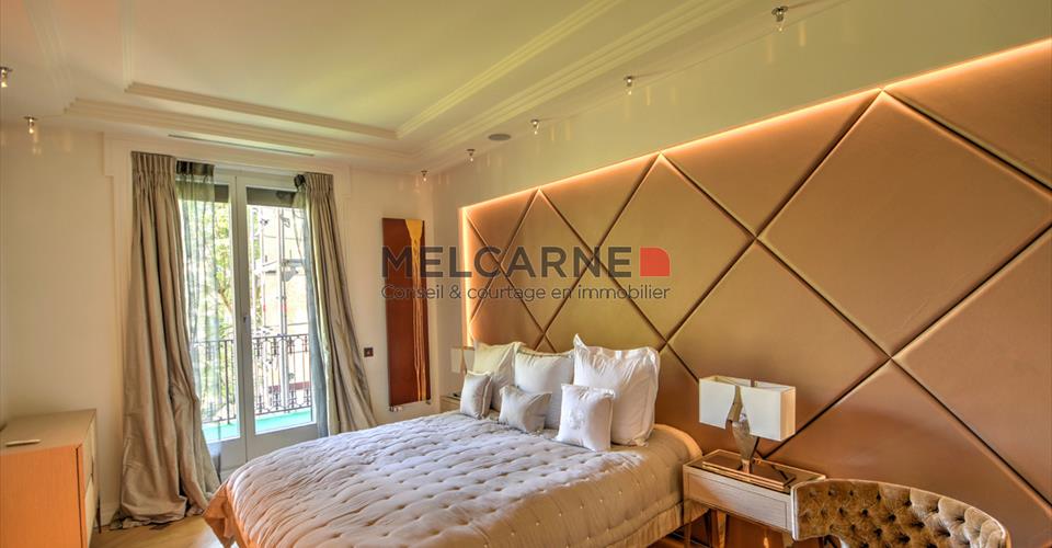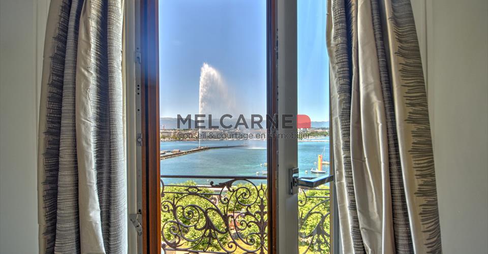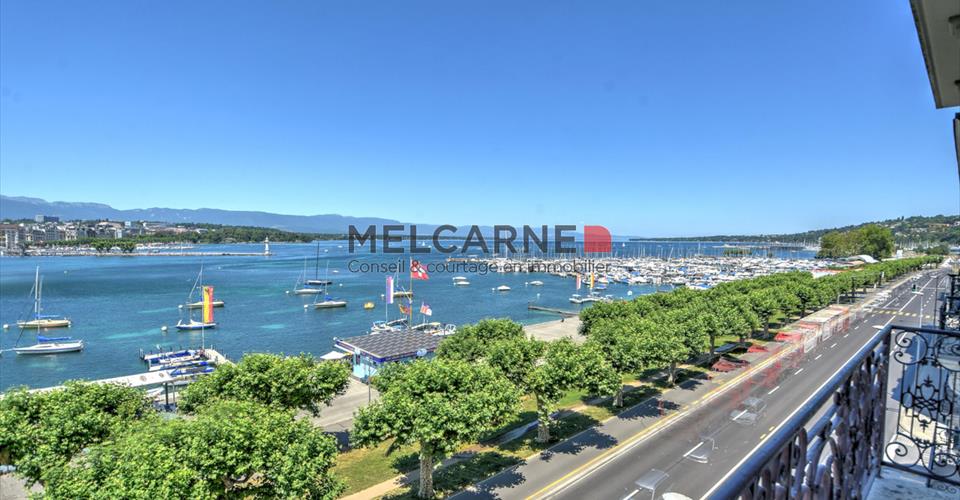 Magnifique appartement entièrement rénové situé sur le très prisé Quai Gustave-Ador. Vous serez séduits par sa superbe vue sur le Lac Léman ainsi que sur le jet d’eau depuis le balcon. Niché au sein d’un immeuble historique, cet espace lumineux et accueillant vous séduira par ses prestations très haut-de-gamme et son ambiance unique, alliant charme et modernité. Idéalement situé en plein centre-ville, vous serez à proximité de toutes les commodités. La distribution se fait comme suit : – hall d’entrée avec vestiaire ; – wc visiteurs ; – cuisine aménagée avec ilot central ouverte sur le séjour ; – espace salle à manger ; – vaste salon accédant au balcon avec vue lac ; – deux chambres côté cour intérieure dont une avec balcon ; – chaque chambre dispose de sa salle de bain et dressing ; – une buanderie privative ; Ce bien rare à la vente représente une belle opportunité si vous êtes à la recherche d’un appartement de standing au coeur de l’une des adresses les plus prestigieuses de Genève. En annexe, vous trouverez un local à vélos, une grande cave ainsi que la possibilité de louer et/ou d’acheter une place de parking. Le calcul des surfaces est le suivant : 189m2 PPE +50% des balcons (10m2), soit 194m2.