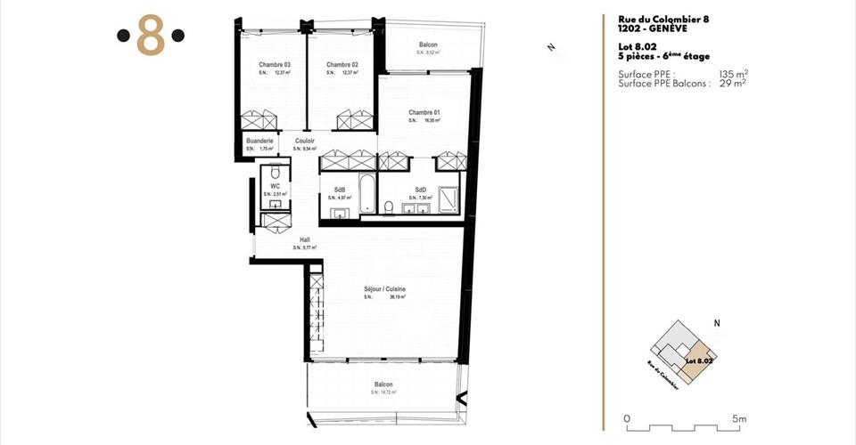 Implantée au coeur de la dynamique Rive droite genevoise, la résidence Colombier 8 propose un cadre de vie privilégié en plein centre-ville. Non loin des grands axes de communication, de la gare Cornavin ainsi que de l’aéroport, cette rive éclectique est appréciée pour sa qualité de vie. Les 21 logements sont réalisés par le bureau Cerutti Architectes SA. Lot 8.02 Cet appartement de 5 pièces est situé au 6ème étage de l’immeuble. Il se distribue comme suit : – Entrée avec armoires encastrées – Séjour/salle à manger avec accès à une loggia de 20m2 PPE – Cuisine ouverte, agencée et équipée – Chambre master avec accès à une loggia de 9m2 PPE et salle de douche en suite – 2 chambres – Salle de bains – Buanderie – Toilettes visiteurs Une cave et une place de parking au rez inférieur complètent ce bien. Les emplacements de stationnement sont obligatoires et inclus dans le prix. * * * 21 appartements en PPE Architectes : Bureau Cerutti Architectes SA Chantier en cours Livraison prévue au 1er semestre 2027 Plus d’informations sur : www.colombier8.ch