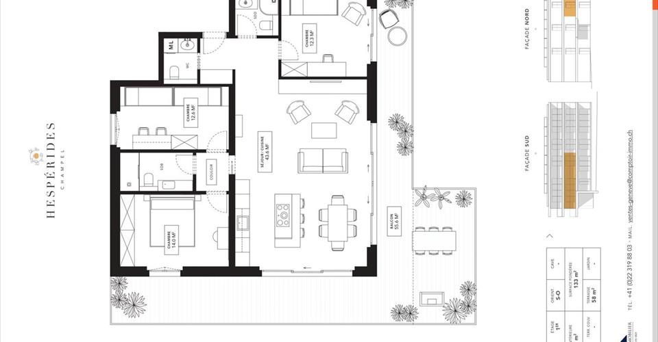 Ce magnifique appartement de 5 pièces est situé au deuxième et dernier étage de la résidence les HESPÉRIDES. Il propose de généreux et lumineux volumes pour une surface PPE de 116 m² et une terrasse de 43 m². Une place de parking extérieure couverte et une cave viennent compléter cet objet. HESPÉRIDES est une promotion de 6 appartements de grand standing, du 3 au 5 pièces, situé à Champel : le quartier résidentiel par excellence. Elle offre un large éventail d’infrastructures et de commodités, tout en bénéficiant d’une desserte optimale par les transports publics. En transports publics, Carouge, les HUG, la gare du CEVA de Champel et le centre de Genève sont à quelques minutes. En voiture, l’accès à l’autoroute et le centre de Genève sont à 5 minutes. D’une architecture contemporaine, aérienne et écoresponsable, le bâtiment de trois étages, privilégie l’environnement et adopte un mode de construction durable à faible impact écologique. HESPÉRIDES répond aux normes HPE (Haute Performance Énergétique), garantissant un équilibre parfait entre confort et durabilité. Idéalement orientés, les appartements s’ouvrent sur de superbes terrasses grâce à de larges baies vitrées. La lumière naturelle illumine les volumes intérieurs et crée une ambiance douce et chaleureuse tout au long de la journée. Généreux, les jardins privatifs en rez-de-chaussée prolongent les séjours et invitent à profiter de moments privilégiés dans un environnement arboré et verdoyant. La haute qualité des finitions témoigne de l?attention portée aux moindres détails, vous assurent un cadre de vie à la fois élégant et fonctionnel. Les six logements sont agencés avec soin afin de créer de grands espaces lumineux et chaleureux. Télécharger la brochure complète : https://hesperides-champel.ch