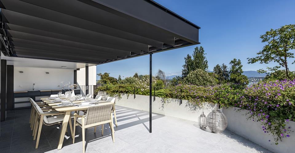 Dernier appartement restant, disponible immédiatement ! Découvrez « LE CINQ », un nouvel immeuble de très haut standing THPE idéalement situé au coeur d’un quartier résidentiel, calme et exclusif, de la très prisée commune de Pregny-Chambésy, à proximité immédiate du lac Léman. Distribué sur 5 niveaux dont un sous-sol, cette résidence propose 7 spacieux et confortables appartements, aux diverses typologies allant du 3 pièces en simplex au 7 pièces en duplex avec rooftop. Ce projet unique, piloté avec minutie et rigueur par FM Management, habituée de réaliser des projets d’exception, a été conçu par le bureau d’architecte de renom DVK Architectes. Nous vous invitons à découvrir l’appartement F, d’une surface PPE de 168 m², au deuxième étage, composé comme suit : – Vaste cuisine, séjour et salle à manger donnant sur la terrasse – Plusieurs terrasses parfaitement exposées dont une en rooftop de 100 m² – Belle vue dégagée sur le lac et le Mont-Blanc – 3 chambres avec salles de bains et armoires intégrées – 2 places de parking intérieures et une cave en annexe – Matériaux et finitions de haute qualité et durabilité – Architecture unique, concept d’éclairage et aménagements extérieurs travaillés avec minutie L’immeuble se trouve à proximité immédiate de la gare de Pregny-Chambésy, de l’Aéroport International de Genève, et des Organisations Internationales notamment. Site dédié : lecinq-pregnychambesy.ch