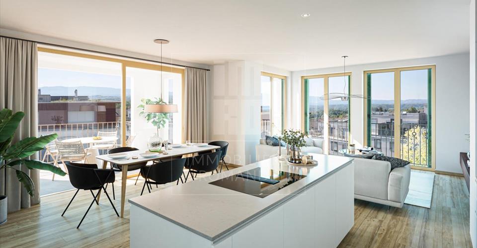 PERMIS EN FORCE ! Le projet ALMATI propose des logements de standing de 3 à 6 pièces, avec des surfaces PPE de 76 à 200 m2. Chaque lot est doublement orienté et dispose d’une terrasse, d’un jardin ou d’une loggia avec vue dégagée sur la campagne. Nous vous proposons à la vente un beau 5 pièces, d’une surface PPE pondérée de 125.10m². Il se compose comme suit : – Un hall d’entrée – Un séjour / salle à manger, permettant d’accéder à la loggia, une cuisine ouverte avec un réduit – 3 chambres – Une salle de bains – Une salle de douche – Un wc visiteurs Une cave complète ce bien Deux places de parking en sous-sol sont à acquérir en sus, à CHF 45’000.-/place. Pour plus de renseignements, contactez notre équipe ? www.almati.ch