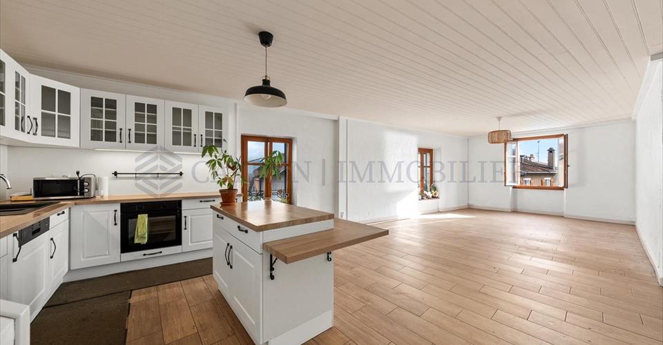 Laissez-vous séduire par le charme de l’ancien associé au confort du contemporain à travers cette ancienne auberge qui fut entièrement réhabilitée avec goût en 2018. Entourée de vignes et de nature, la bâtisse datant du XVIIIe siècle offre un cadre de vie unique et de nombreux atouts. L’appartement est vide et ne nécessite aucune rénovation ou mise en conformité, il est aménageable immédiatement. En effet, récemment adapté aux dernières normes énergétiques, le bâtiment présente un toit refait à neuf, une isolation complète, des fenêtres en double vitrages et une pompe à chaleur. Le chauffage est au sol avec un compteur individuel par pièces et les charges mensuelles sont très basses. Faisant partit d’une chaleureuse PPE de 5 appartements, ce duplex est non seulement accompagné d’un box aménageable de 37m2, mais aussi d’une grande terrasse extérieure de 30 m2 et d’agréables jardins communs offrant une vue sur le Jura et les vignes. De nombreuses places visiteurs sont disponibles à l’entrée de la résidence et l’arrêt du bus menant directement à la gare se trouve en face de l’immeuble. Ce bien d’exception présente de spacieux espaces de vie, une luminosité optimale et de généreuses chambres et salles d’eau. Le maintient d’éléments d’origine tels que les portes ou le cadre des fenêtres apportent originalité et cachet et s’allient parfaitement avec le style contemporain. L’appartement se distribue comme suit : Premier niveau : – Une cuisine équipée ouverte – Un spacieux séjour – Une grande chambre – Une première salle d’eau (douche) – Une deuxième salle d’eau (salle de bain) Deuxième niveau: – Une deuxième chambre dans les combles avec rangements – Une troisième chambre dans les combles avec rangements – Un box intérieur en sus au prix de 50 000 CHF Depuis l’extérieur, un accès à des WC visiteurs sont prévus ainsi qu’au local technique. N’hésitez pas à nous solliciter pour organiser une visite des lieux à votre meilleure convenance.