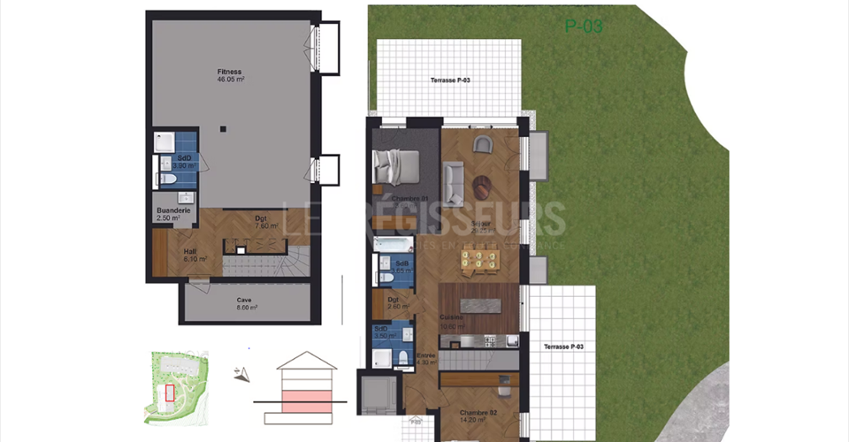 Plus que 6 appartements disponibles ! Situé au coeur du village de Peney, cet appartement neuf de 5 pièces combine confort moderne, espaces généreux et environnement verdoyant. Idéal pour les familles à la recherche de calme tout en restant proches du centre de Genève. Livraison prévue : Printemps 2026 Les atouts de ce bien : – 5 pièces réparties sur 2 niveaux – 3 chambres spacieuses et lumineuses – 3 salles de bain dont une à l’entresol – Grand espace fitness privé ou possibilité d’y créer une master suite – 2 terrasses et un grand jardin privatif – Cuisine ouverte avec coin repas – Ambiance intérieure contemporaine et personnalisable ( choix des matériaux par l’acheteur) – Buanderie privative avec arrivée/sortie d’eau – Cave incluse Performance & confort moderne : – Chauffage géothermique et panneaux solaires photovoltaïques – Exposition sud-ouest – Accès direct au parking souterrain : sécurisé ( places de parking disponibles en sus : Places intérieures 45’000.- box : 55’000.- ) Cadre et situation géographique : – Environnement calme et champêtre, à deux pas des vignobles et du domaine de Châteauvieux – Transports : Bus 70/73 à 3 minutes à pied, gare de Satigny accessible rapidement – Idéal pour les familles recherchant tranquillité et proximité urbaine