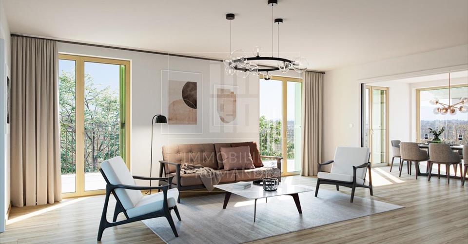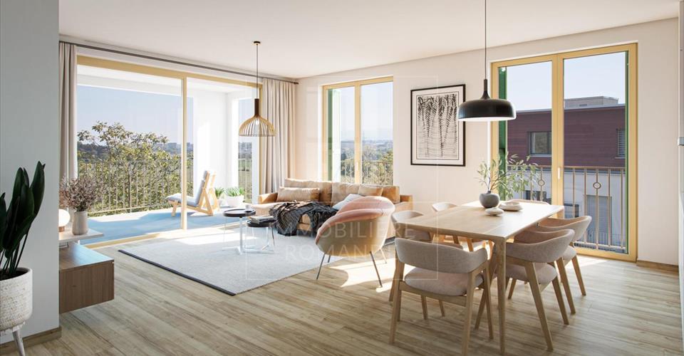 PERMIS EN FORCE ! LE PROJET Grâce à son architecture au style villageois alliant tradition et modernité, le projet ALMATI s’intègre parfaitement à son environnement bucolique. Composé d’un sous-sol et de 13 logements répartis sur 4 niveaux accessibles par ascenseur, l’immeuble est construit selon les standards MINERGIE ECO, garantissant ainsi une conception durable, une haute efficacité énergétique et un confort optimal pour les habitants. Les aménagements extérieurs ont été soigneusement pensés afin de favoriser le bien-être des habitants. Un verger avec différentes essences d’arbres fruitiers et une place commune avec bancs invitant à la détente et aux rencontres composent l’entrée de la résidence. Exclusivement piétons, les aménagements de surface assurent quiétude et sécurité, particulièrement pour les enfants. Par ailleurs, la mobilité douce est favorisée avec de nombreux emplacements pour vélos dans le garage souterrain et à l’entrée de l’immeuble. LES APPARTEMENTS Le projet ALMATI propose des logements de standing de 3 à 6 pièces, avec des surfaces PPE de 76 à 200 m2. Chaque lot est doublement orienté et dispose d’une terrasse, d’un jardin ou d’une loggia avec vue dégagée sur la campagne. Nous vous proposons à la vente un beau 5 pièces, d’une surface PPE pondérée de 125.10m². Il se compose comme suit : Un hall d’entrée desservant un séjour / salle à manger, permettant d’accéder à la loggia, une cuisine ouverte avec un réduit, 3 chambres, une salle de bains, une salle de douche et un wc visiteurs. Une cave complète ce bien. Une place de parking en sous-sol est à acquérir en sus, à CHF 45’000.-. Pour plus de renseignements, contactez notre équipe ? www.almati.ch