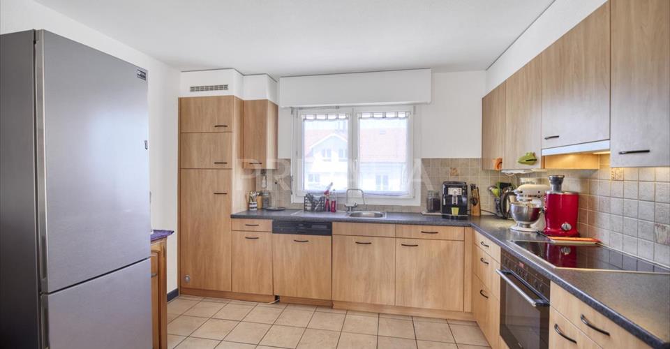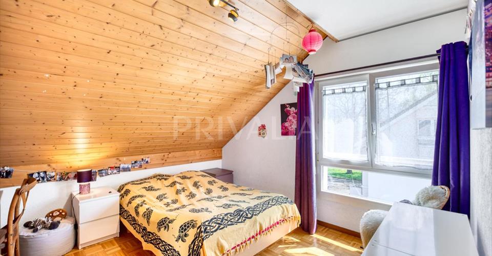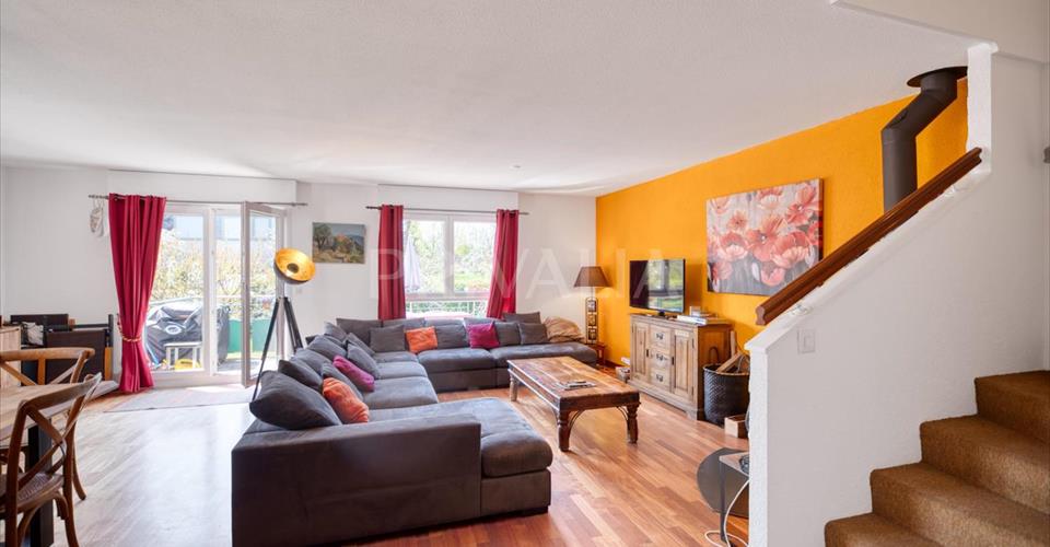 Situé dans une charmante résidence construite dans les années 2000, ce duplex en pignon bénéficie d’une belle luminosité grâce à son orientation sud-ouest et à ses volumes généreux. D’une surface PPE de 158 m², il se répartit sur le premier étage et les combles d’un immeuble de trois niveaux, et profite d’un balcon de 15 m² avec vue dégagée sur la campagne environnante. Partie jour (1er étage) : – Hall d’entrée avec WC visiteurs et espace buanderie – Spacieuse cuisine ouverte, entièrement équipée – Vaste séjour-salle à manger avec poêle à bois – Accès direct à un balcon orienté sud-ouest avec vue dégagée – Espace buanderie Partie nuit (Combles) : – Trois chambres à coucher – Une salle de bains avec WC – Une salle de douche – Possibilité d’aménager une quatrième chambre Extérieurs et annexes : – Deux places de parking extérieures – Une cave Ce bien offre un cadre de vie confortable, alliant le calme d’un environnement résidentiel paisible à la proximité des commodités du charmant village viticole et agricole de Soral, où nature et qualité de vie sont au rendez-vous.