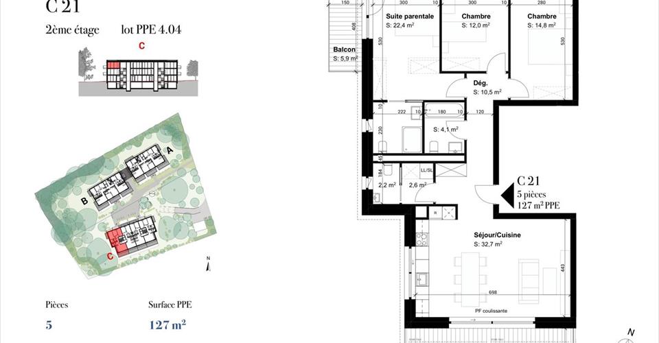 Ce superbe appartement de 5 pièces est situé au deuxième étage du bâtiment C de la résidence le CLOS DES CHARMES. Il propose une propose de généreux et lumineux volumes pour une surface PPE de 127 m², une terrasse de 28 m². Une place de parking en sous-sol et une cave viennent compléter ce superbe objet. Le CLOS DES CHARMES est un projet novateur et audacieux, situé au calme absolu dans un parc de 8’000 m². D’une architecture résolument contemporaine, cette résidence se compose de trois bâtiments parfaitement intégrés dans leur environnement, offrant 28 appartements du 3 au 6 pièces. Les lignes fluides et les volumes savamment orchestrés offrent de généreuses et profondes terrasses, balcons et jardins, idéalement exposés et tournés vers la nature. Les appartements, judicieusement orientés, bénéficient de prestations de haut standing et viennent confirmer le caractère unique de la résidence. Leur luminosité est garantie par les larges vitrages. Les cuisines ouvertes sur les séjours, dont l’agencement invite au partage et à la convivialité, permettent d’optimiser les volumes et d’apporter une sensation d’espace et de liberté. En surface, un lieu d’échange et de vie est créé pour les habitants. Les aménagements piétonniers donnent accès au magnifique parc arboré, concourant ainsi à la tranquillité des lieux. La circulation des véhicules se fera uniquement en sous-sol, les bâtiments étant reliés par un parking souterrain. La proximité des commodités, des écoles, collèges, commerces, transports publics et axes principaux font partie des atouts de cette élégante résidence à taille humaine et répondant aux normes THPE (Très Haute Performance Energétique). Les chemins piétonniers qui sillonnent le quartier, la Voie Verte à proximité, permettent de se déplacer au quotidien en toute sérénité. La liaison ferroviaire Cornavin – Eaux-Vives – Annemasse (CEVA), avec la gare de Chêne-Bourg voisine, conforte l’attractivité de la résidence. En savoir plus : – https://closdescharmes.ch/ – https://comptoir-immo.ch/projets/clos-des-charmes/