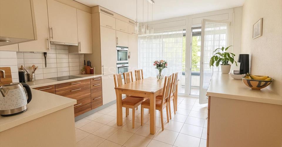 Découvrez ce magnifique appartement traversant de 5 pièces, idéalement situé dans un quartier résidentiel clame et familial de Vernier. Situé au 2ème étage d’un immeuble contemporain construit en 2008, ce bien lumineux offre une distribution optimale et des finitions de qualité. Distribution de l’appartement : – Grand salon avec accès direct à un balcon exposé plein sud, parfait pour profiter du soleil toute la journée. – Cuisine semi-ouverte, moderne, entièrement équipée, avec un accès à la loggia. – Trois chambres, dont une suite parentale avec sa salle de douche privative et branchement pour machine à laver/sécher. – Salle de bain séparée avec baignoire, WC et lavabo. – Nombreux rangements intégrés. – Revêtements : parquet dans les pièces à vivre, carrelage dans les pièces d’eau. – Une pièce est actuellement utilisée comme bureau ouvert sur le salon – possibilité simple de la refermer pour retrouver une vraie 3ème chambre Caractéristiques : – Type de bien : Appartement en PPE – Surface PPE : 110 m² + loggia de 7 m² + balcon de 13 m² – Pièces : 5 (dont 3 chambres) – Salles d’eau : 2 ( 1 salle de bain, 1 salle de douche dans la suite parentale) – Parking : 1 place intérieure incluse – Cave :oui – Année de construction : 2008 – Etage : 2ème étage avec ascenseur Atouts : – Très bonne luminosité grâce à une orientation sud – À proximité immédiate des transports publics ( bus à 4 minutes, gare à 12 minutes à pied) – Accès rapide à l’autoroute A1 et à l’aéroport de Genève – Commerces, écoles, crèches et et services à quelques pas – Parc animalier de l’Esplanade et espaces verts à proximité – Environnement calme, verdoyant et urbain à la fois N’hésitez pas à nous contacter pour plus d’informations !