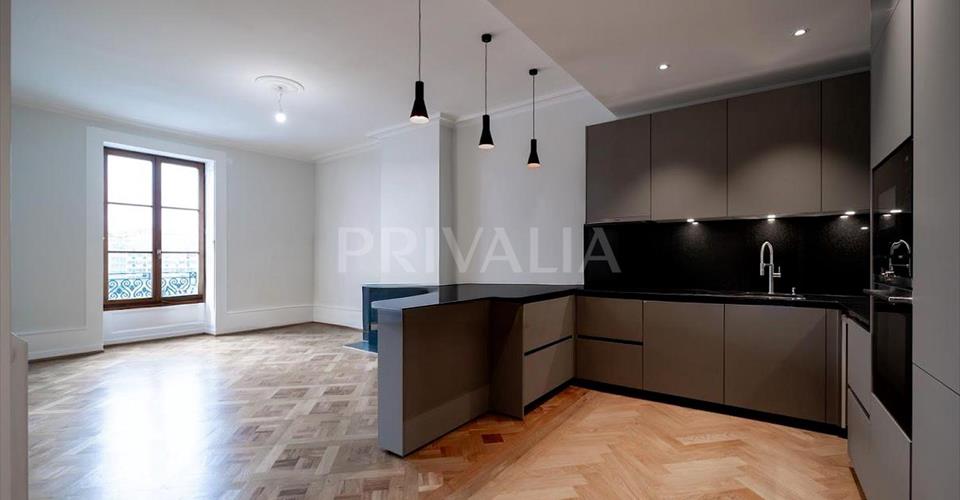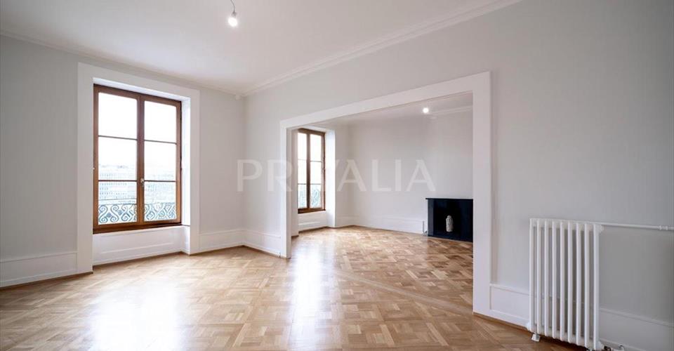 Idéalement situé sur le prestigieux Quai des Bergues, cet appartement traversant de 5 pièces, d’environ 120 m2 jouit d’une situation unique avec une magnifique vue sur la rade. Entièrement rénové avec des matériaux de qualité, il allie le charme de l’ancien avec parquet anciens, belle hauteur sous plafond et cheminée décorative, avec le confort du contemporain. Il se compose comme suit : – Vaste séjour d’environs 50m2 avec cheminée décorative – Cuisine ouverte entièrement équipée et agencée – Grande chambre lumineuse avec dressing et sa salle de bains attenante – 2 chambres à coucher – Salle de douche – WC visiteurs – Buanderie Une cave complète ce bien. L’immeuble, de standing, dispose d’un ascenseur et d’un accès sécurisé. Situation unique et recherchée, directement sur les quais, à proximité des transports publics, commerces, école primaire et école internationale, à deux pas des rives du Lac et du centre-ville de Genève.