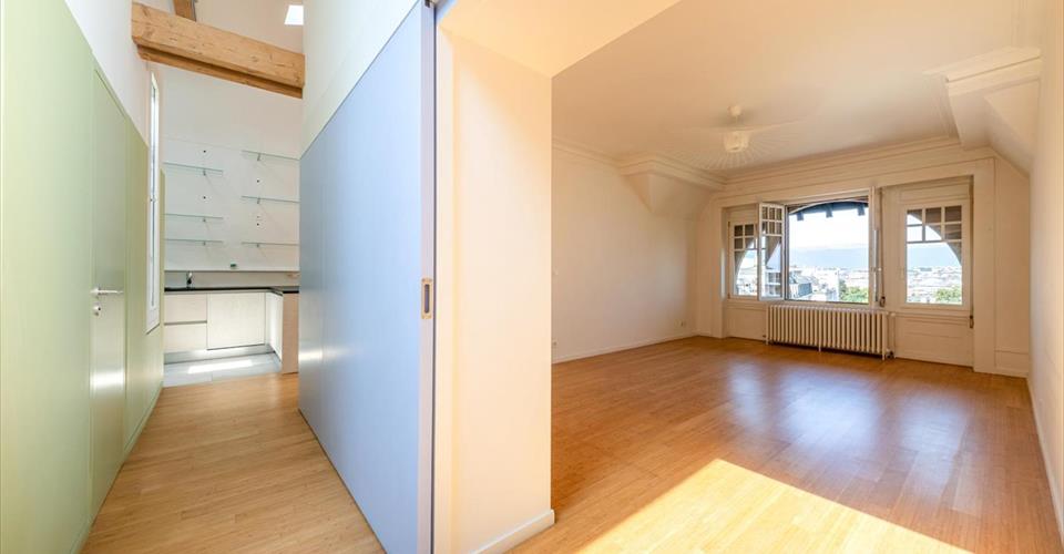 Dans le quartier résidentiel de Champel, aux portes de la Vieille-Ville, de l’Eglise Russe, du parc de Malagnou et de toutes les commodités. Cet attique situé au 5ème étage, d’un bel immeuble de style classique se distribue comme suit : Un vaste hall d’entrée, une cuisine entièrement équipée (réfrigérateur, congélateur, four, micro-ondes, plaques, hotte, lave-vaisselle, cave à vin, racccordement lave-linge/sèche-linge), salle à manger avec accès à la mezzanine, séjour, deux grandes chambres avec salle de bains/wc dont une avec une douche, wc séparé pour les invités. Cave à disposition. Charges mensuelles : CHF 285.-en sus. Disponibilité : Immédiatement.