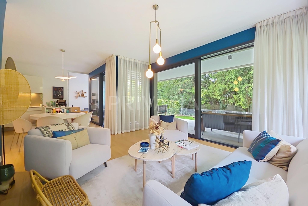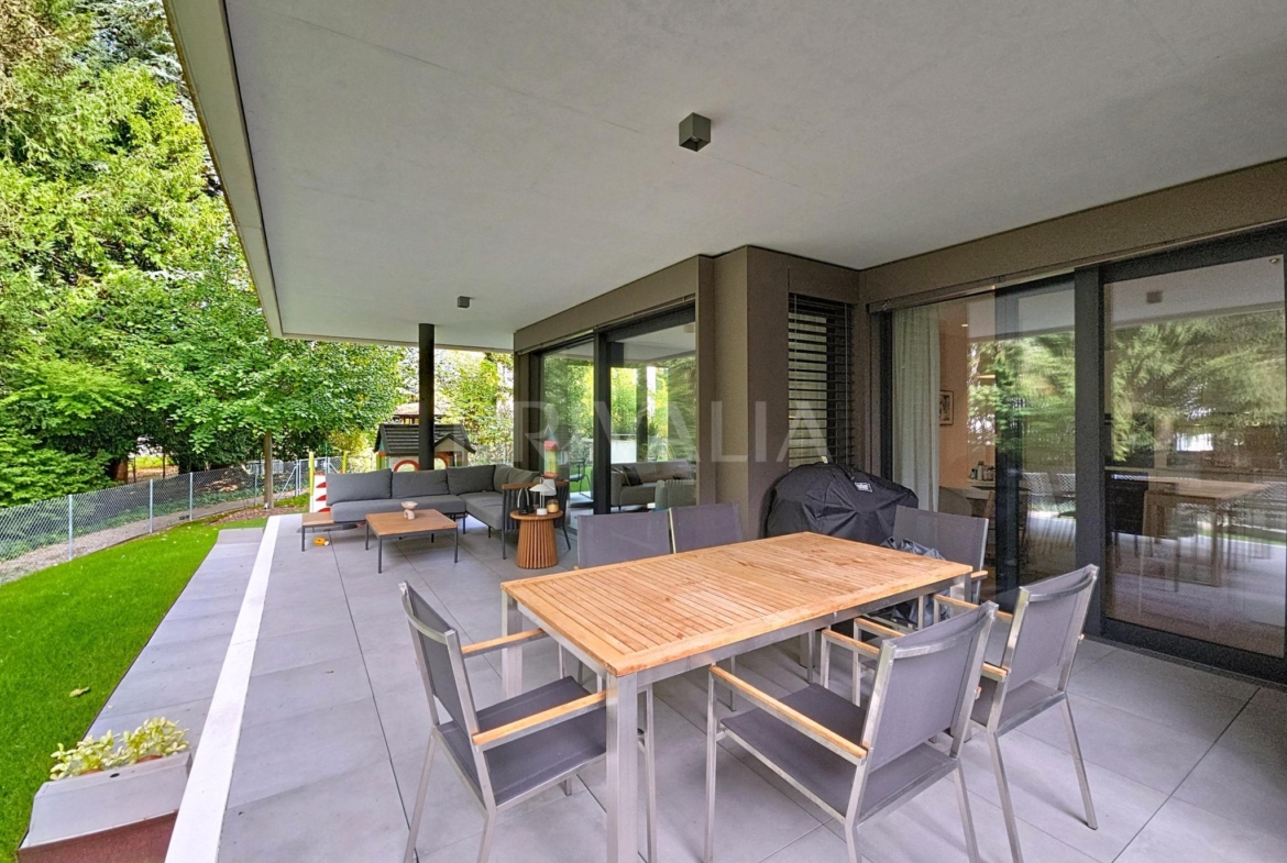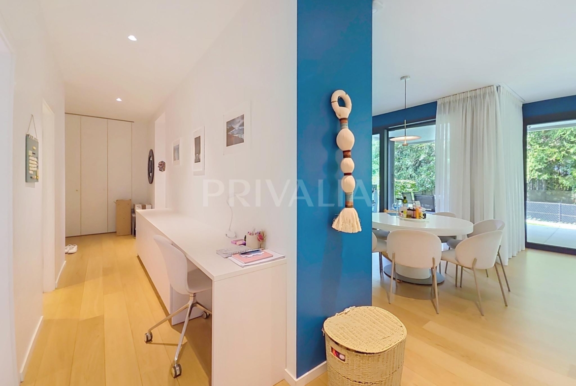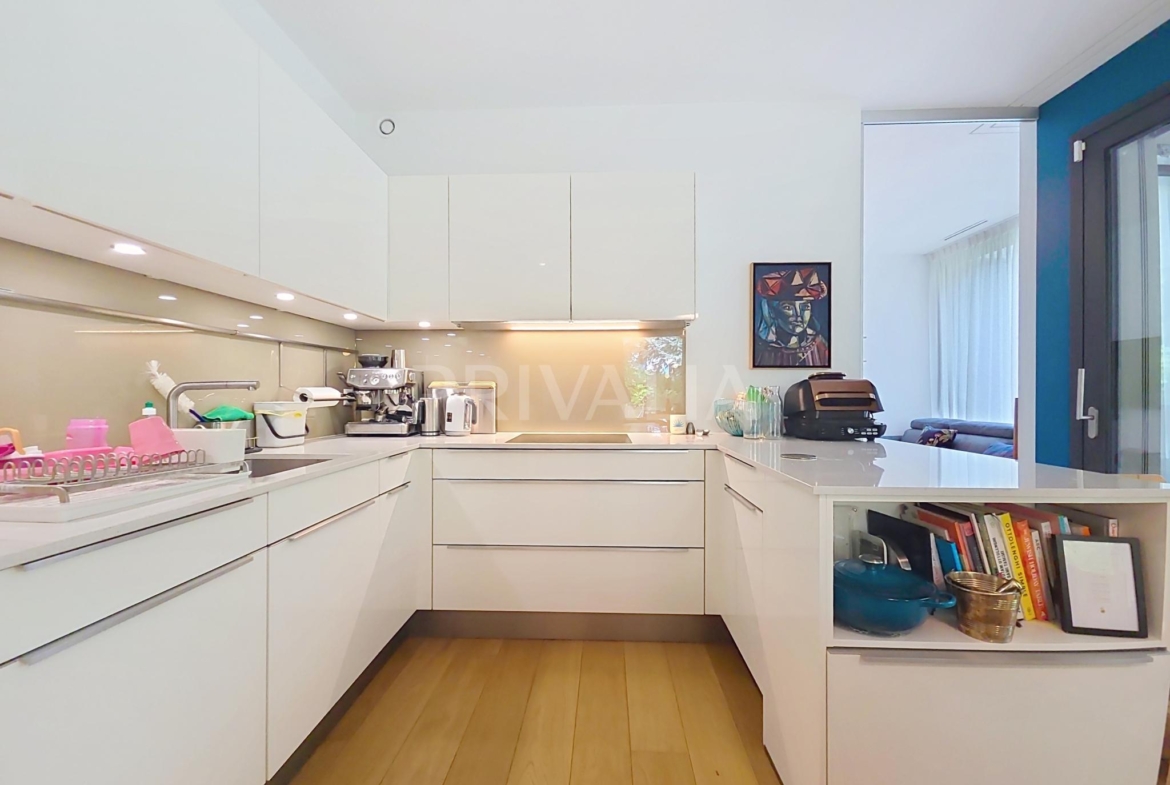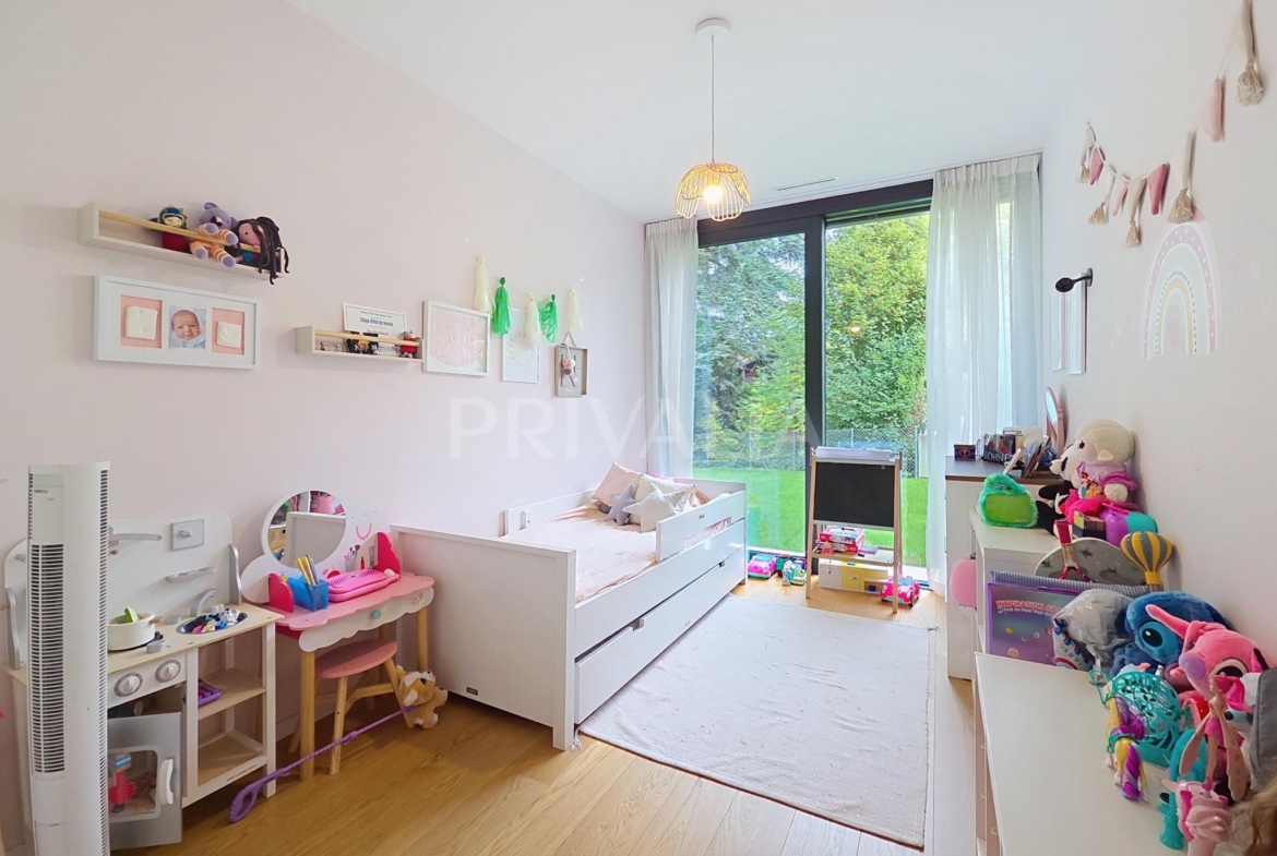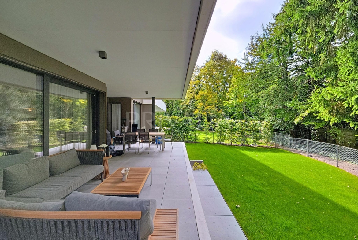 Au sein de la résidence contemporaine “Crêts de Pregny” sous le label THPE (très haute performance énergétique) et offrant une architecture contemporaine avec toiture végétalisée, cet appartement contemporain et fonctionnel dispose de beaux espaces et profite de matériaux de haute qualité tels qu’une cuisine ouverte entièrement équipée et agencée, salles d’eau modernes, parquet, stores électriques, chauffage au sol avec système “geocooling” ou encore baies vitrées coulissantes. Par ailleurs, il bénéficie d’une belle terrasse et d’un jardin d’environ 230 m2. Ce dernier est équipé d’un système d’arrosage automatique, d’une tondeuse électrique et de luminaires extérieurs.