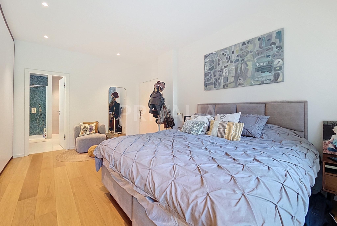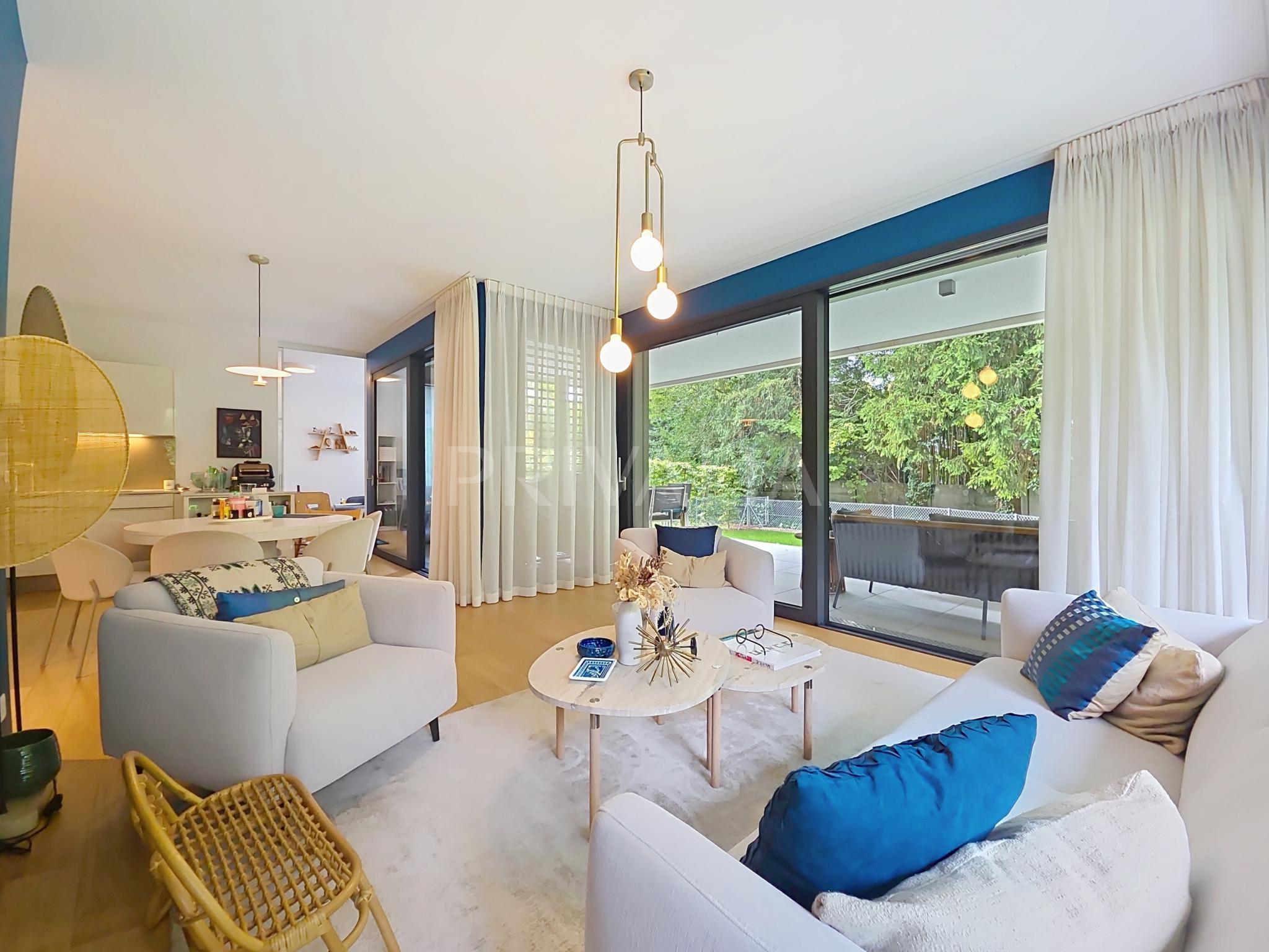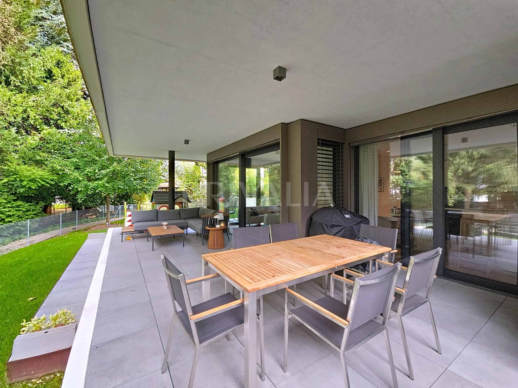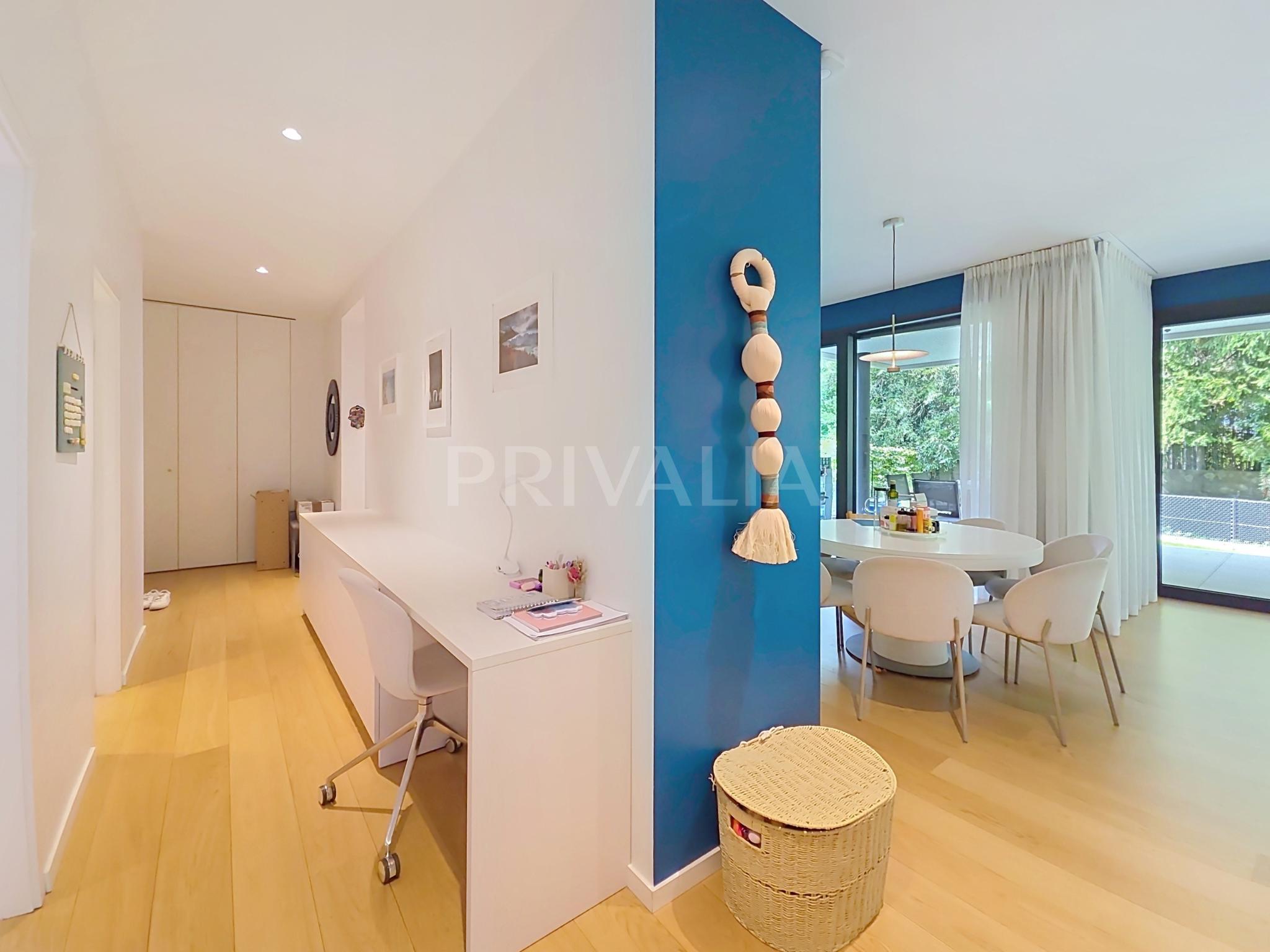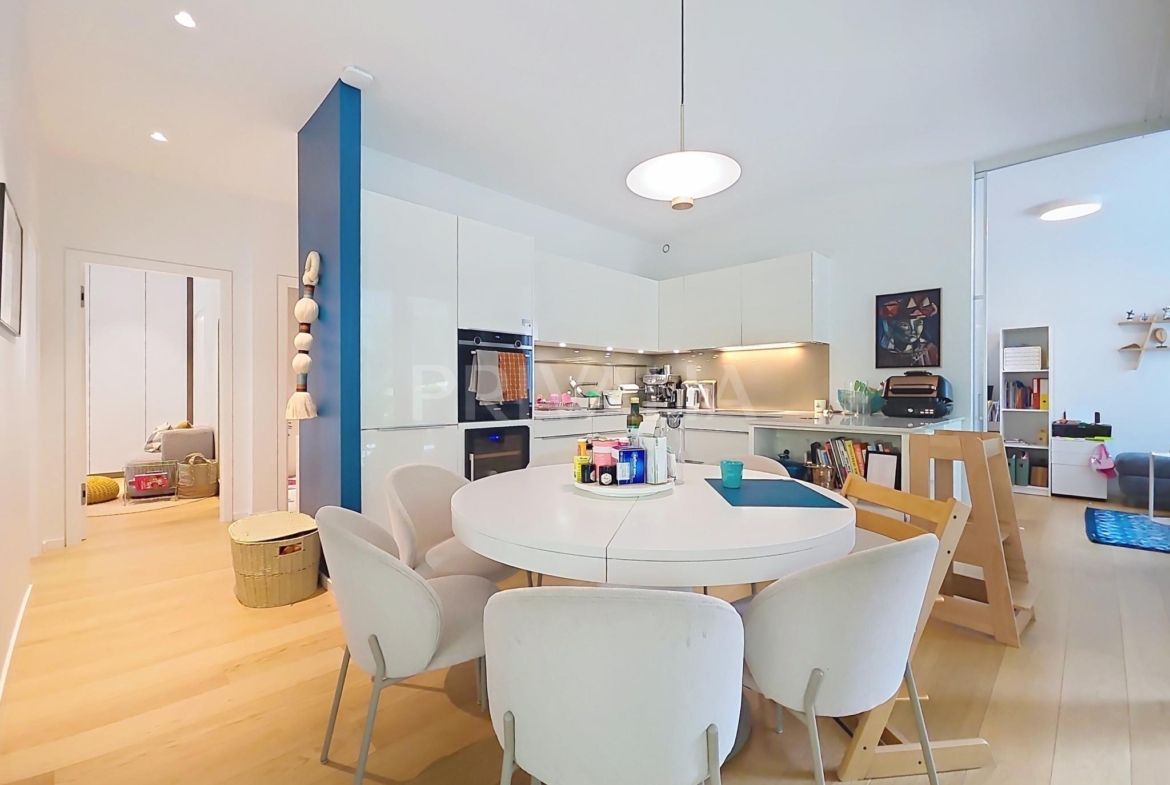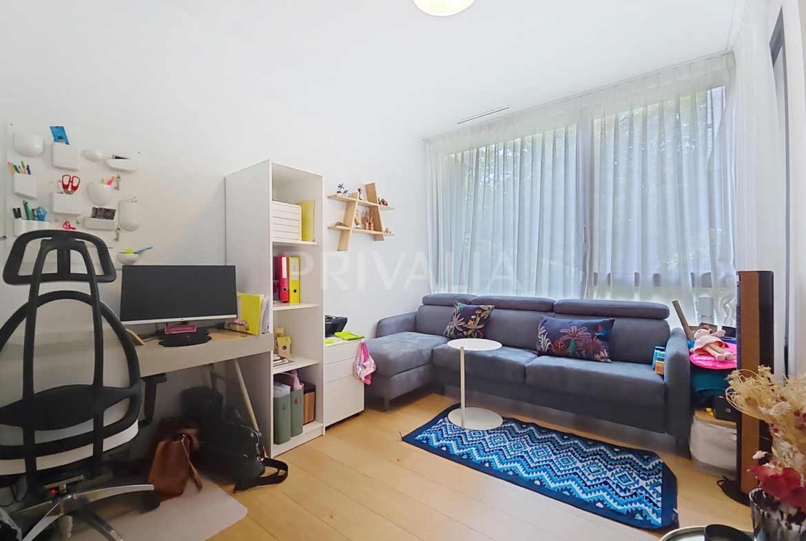 Au sein de la résidence contemporaine “Crêts de Pregny” sous le label THPE (très haute performance énergétique) et offrant une architecture contemporaine avec toiture végétalisée, cet appartement contemporain et fonctionnel dispose de beaux espaces et profite de matériaux de haute qualité tels qu’une cuisine ouverte entièrement équipée et agencée, salles d’eau modernes, parquet, stores électriques, chauffage au sol avec système “geocooling” ou encore baies vitrées coulissantes. Par ailleurs, il bénéficie d’une belle terrasse et d’un jardin d’environ 230 m2. Ce dernier est équipé d’un système d’arrosage automatique, d’une tondeuse électrique et de luminaires extérieurs.