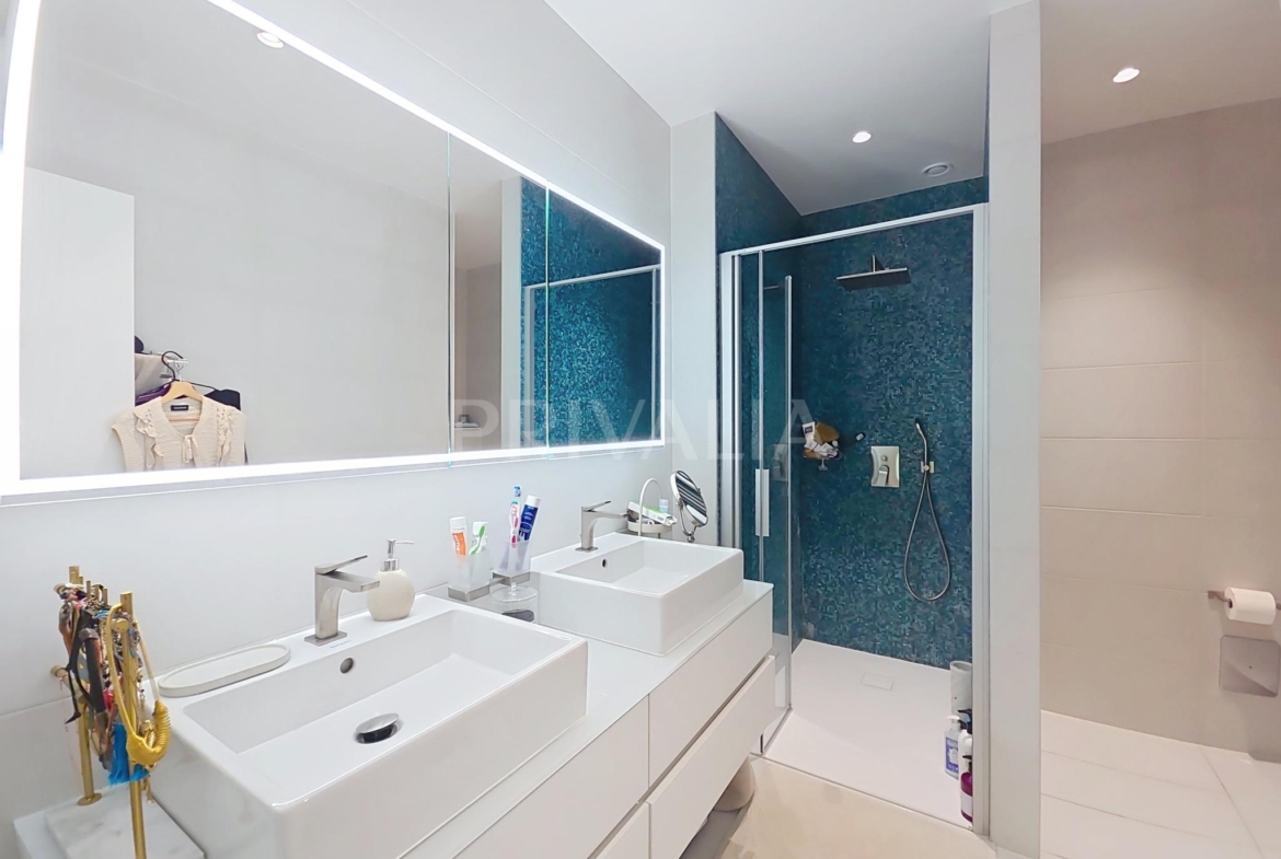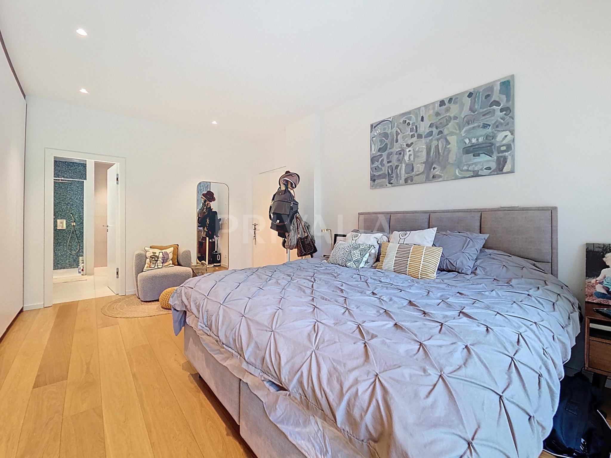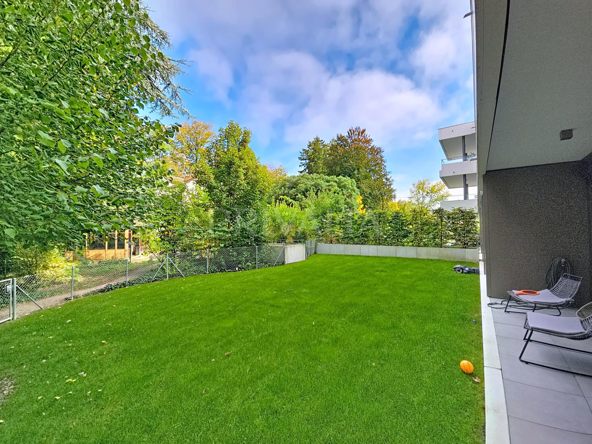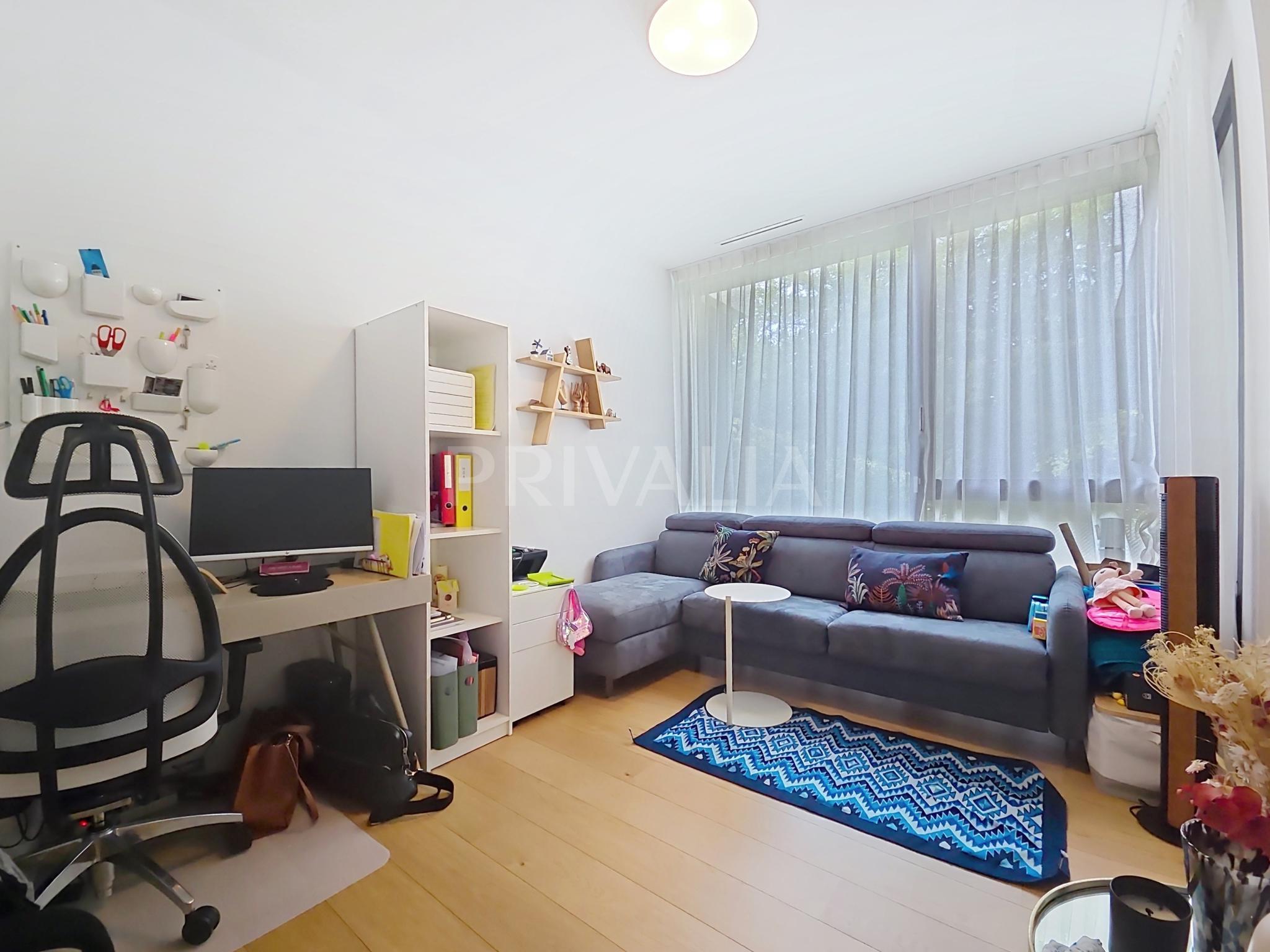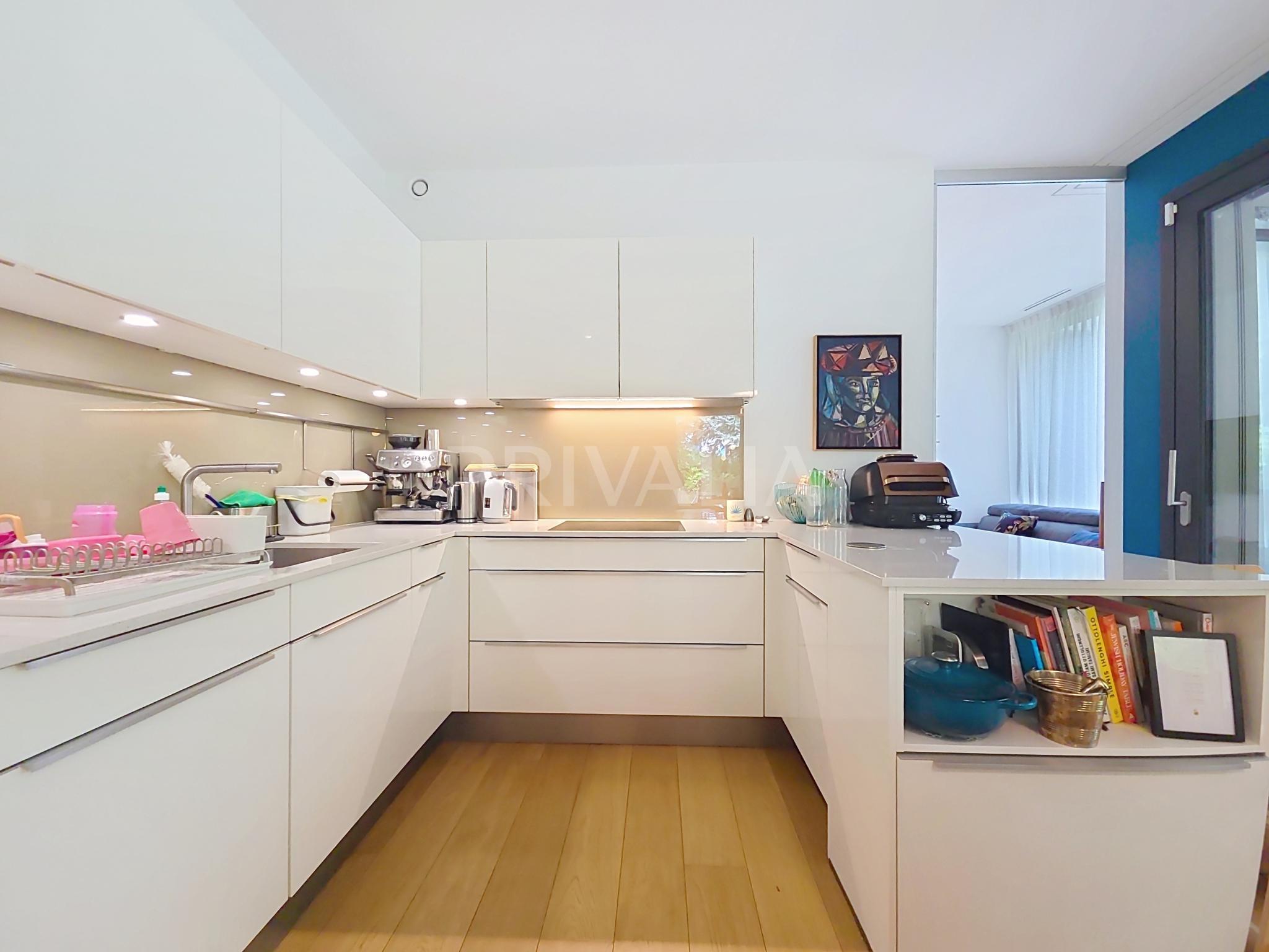 Au sein de la résidence contemporaine “Crêts de Pregny” sous le label THPE (très haute performance énergétique) et offrant une architecture contemporaine avec toiture végétalisée, cet appartement contemporain et fonctionnel dispose de beaux espaces et profite de matériaux de haute qualité tels qu’une cuisine ouverte entièrement équipée et agencée, salles d’eau modernes, parquet, stores électriques, chauffage au sol avec système “geocooling” ou encore baies vitrées coulissantes. Par ailleurs, il bénéficie d’une belle terrasse et d’un jardin d’environ 230 m2. Ce dernier est équipé d’un système d’arrosage automatique, d’une tondeuse électrique et de luminaires extérieurs.