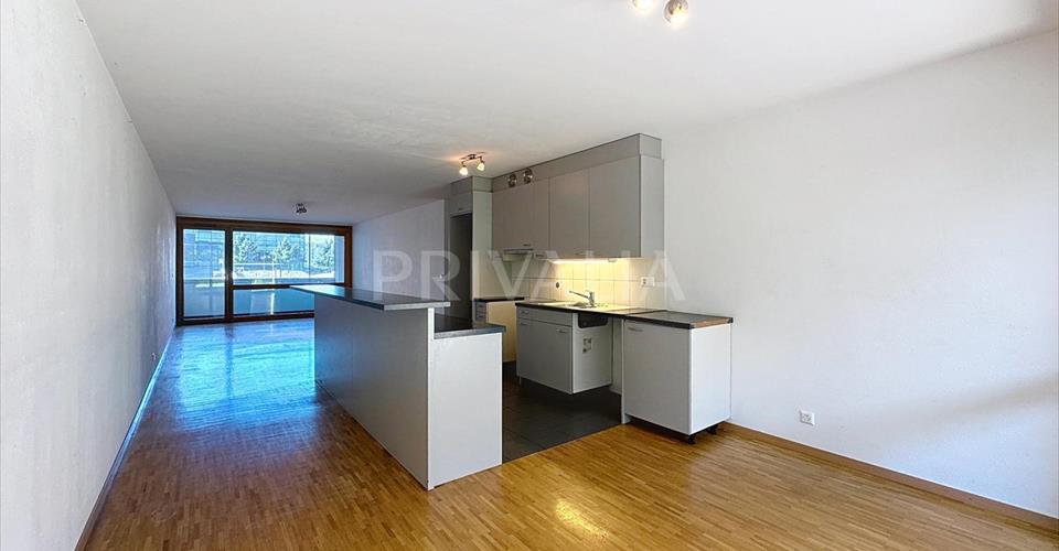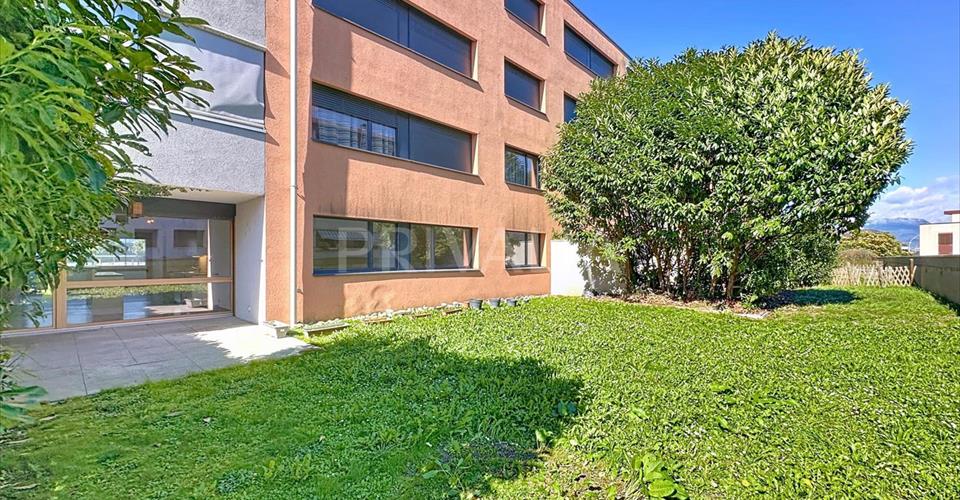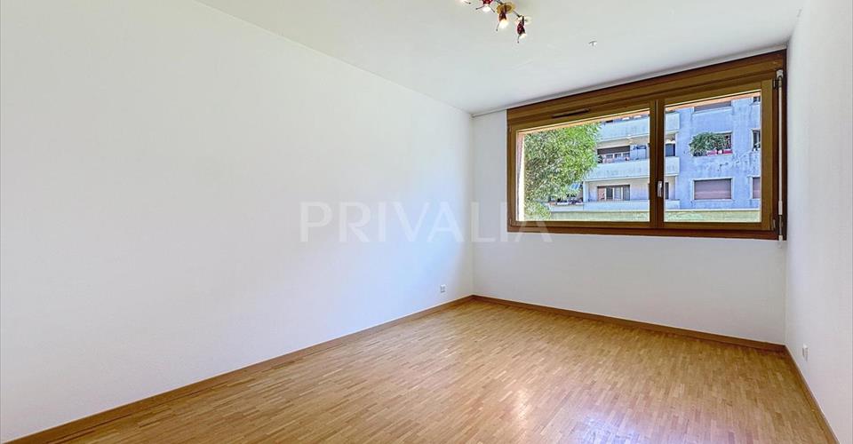 Situé dans la commune du Grand-Saconnex, dans le secteur des Organisations Internationales, ce bel appartement en rez-de-jardin d’environ 120 m2 habitables offre un cadre de vie agréable avec ses 5 pièces, dont 3 chambres à coucher. Situé dans un immeuble récent et sécurisé, il se distribue comme suit : – Hall d’entrée – Séjour / salle à manger, accès loggia et à la terrasse et jardin – Cuisine ouverte agencée – Chambre à coucher avec accès loggia – 2 chambres à coucher – Salle de douche avec WC et raccordement pour lave-linge / sèche-linge – Salle de bains avec WC Annexes : – Une cave – Une place de parking intérieure (CHF 160.- /mois en sus) – Buanderie commune Les commodités sont à proximité immédiate (écoles, restaurants, centre commercial, poste, banque). L’appartement se trouve à 10 minutes des organisations internationales, à 10 minutes de l’aéroport avec le bus n°58 qui est desservi directement devant l’immeuble. Charges mensuelles en sus (CHF 300.-/mois)