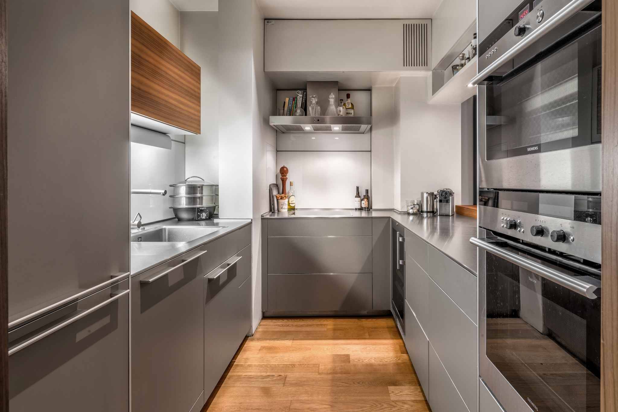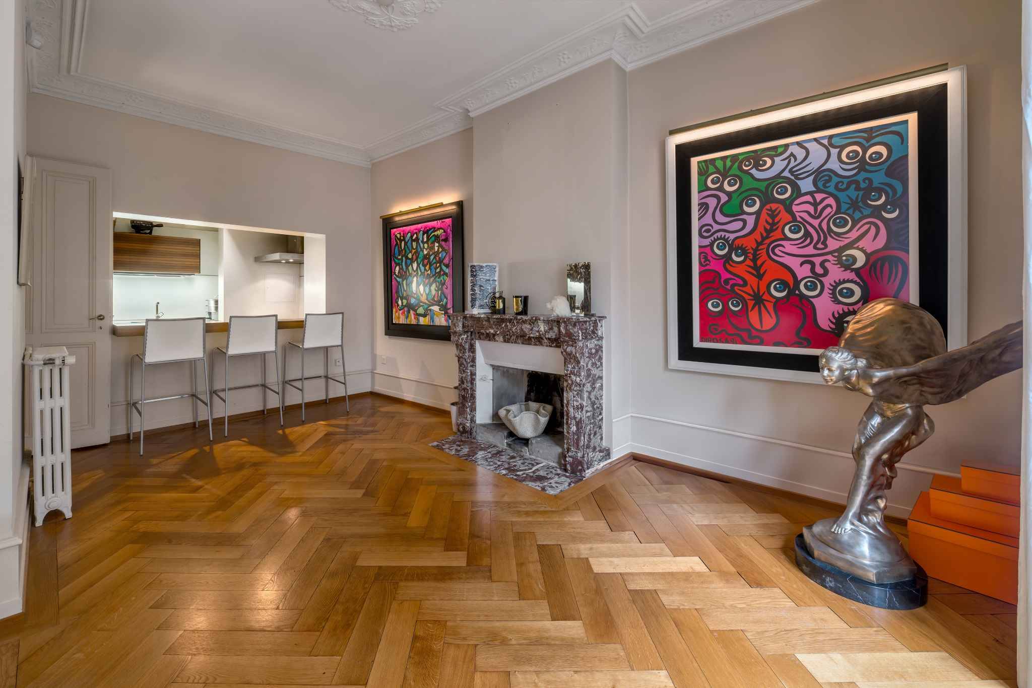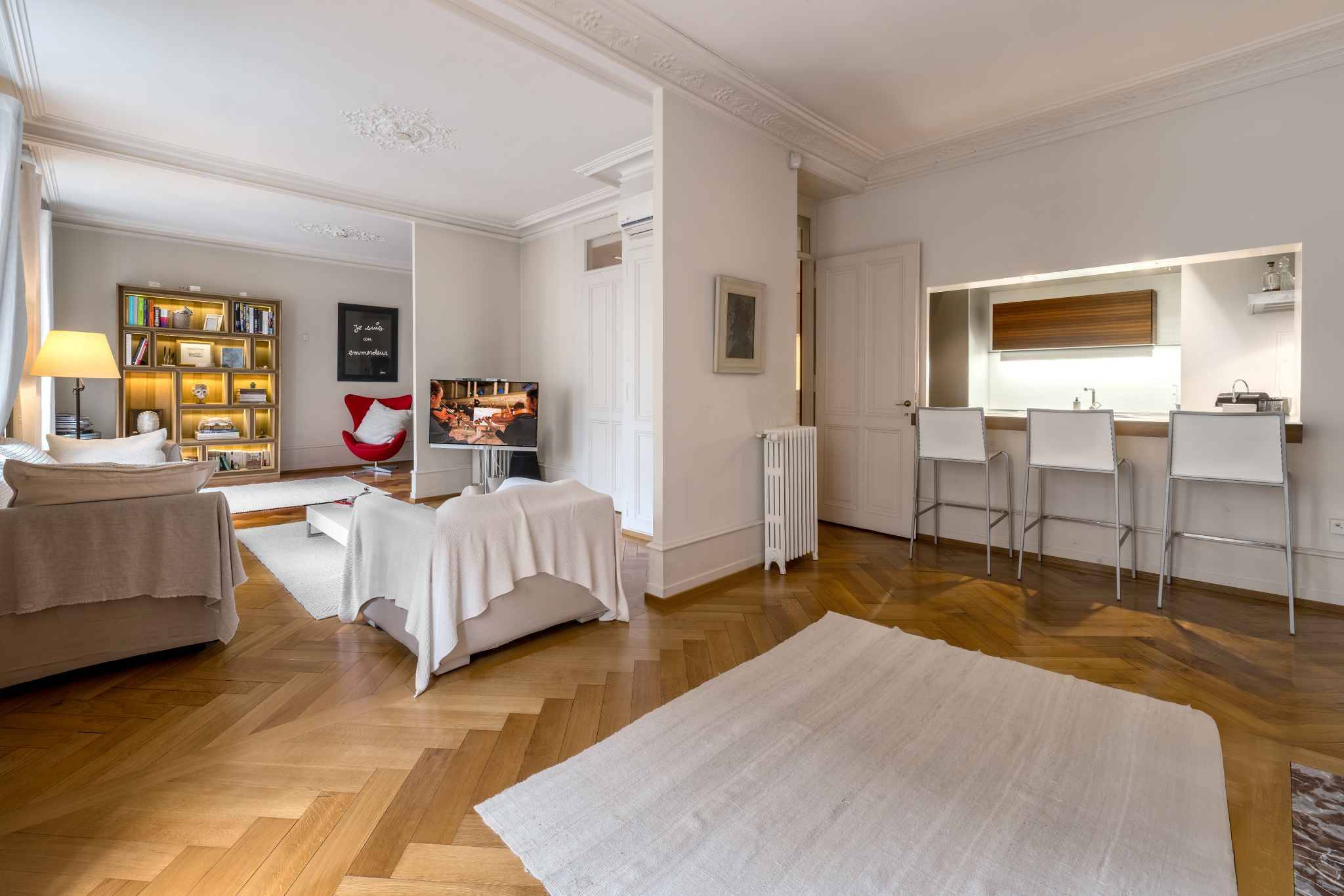 La cuisine équipée avec un bar est semi-ouverte sur la salle à manger qui se prolonge par un double séjour avec un beau parquet point de Hongrie.