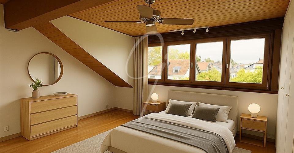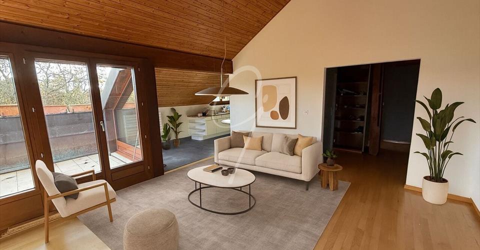 PRIX REVISE A LA BAISSE Superbe attique lumineux à Bogis-Bossey – Vue imprenable, espace et confort – CHF 1’690’000.– CHF Situé dans un cadre paisible et verdoyant, cet attique exceptionnel de 195 m² habitables + mezzanine est proposé au prix de CHF 1’790’000.-. Offrant un cadre de vie unique au sein d’une PPE de seulement 8 appartements, il allie espace, luminosité et sérénité. Points forts : • Espace généreux : 6.5 pièces, dont 3 chambres + mezzanine, et une vaste pièce à vivre modulable. • Lumière et panorama : Grandes baies vitrées, double vitrage récent et deux terrasses (plein sud et est) offrant une vue dégagée sur les champs, la forêt et les montagnes. • Cuisine haut de gamme : Équipée de deux fours (traditionnel/micro-ondes et vapeur), une grande plaque à induction et un agencement fonctionnel. • Confort et charme : • Cheminée, chauffage au mazout par radiateurs. • Cave à vin climatisée, buanderie privée et une autre commune. • Deux salles d’eau : • Une salle de douche avec WC. • Une salle de bains avec baignoire à bulles, WC et espace dédié à la colonne de lavage. • Extérieurs et commodités : • Trois places de stationnement : un garage fermé, une place dans le garage commun fermé, et une place extérieure avec borne de recharge. • Parcelle commune avec barbecue à disposition des copropriétaires. Emplacement idéal • À quelques minutes de l’autoroute, facilitant l’accès à Genève et Lausanne. • Léman Express et transports publics à proximité, idéal pour les déplacements. • Écoles et commerces à Chavannes-de-Bogis, avec le centre Manor à quelques minutes. • Restaurants et services variés accessibles rapidement. • À seulement 10 minutes de Nyon. Charges PPE : 720 CHF/mois (hors chauffage) incluant entretien du jardin, fonds de rénovation et assurance bâtiment. Une opportunité rare pour ceux qui recherchent espace, confort et sérénité, tout en restant proche des commodités.