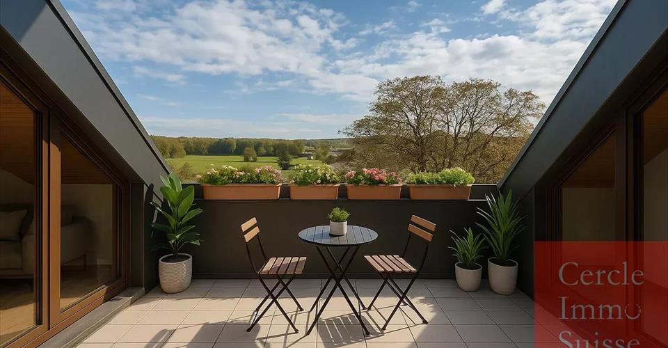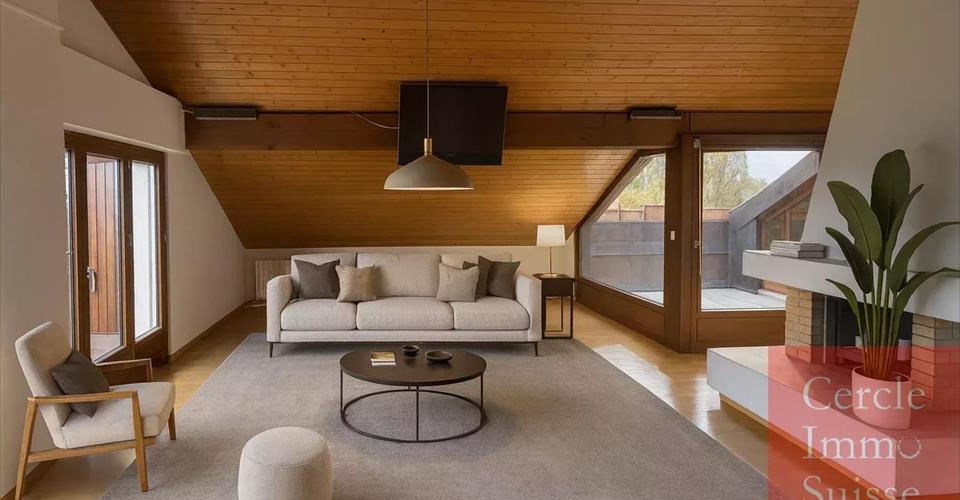 Construit en 1976 et situé dans un cadre paisible et verdoyant, cet attique exceptionnel de 195 m² habitables + mezzanine est proposé au prix de CHF 1’690’000.-. Offrant un cadre de vie unique au sein d’une PPE de seulement 8 appartements, il allie espace, luminosité et sérénité. Points forts : – Espace généreux : 6.5 pièces, dont 3 chambres + mezzanine, et une vaste pièce à vivre modulable. – Lumière et panorama : Grandes baies vitrées, double vitrage récent et deux terrasses (plein sud et est) offrant une vue dégagée sur les champs, la forêt et les montagnes. – Cuisine haut de gamme : Équipée de deux fours (traditionnel/micro-ondes et vapeur), une grande plaque à induction et un agencement fonctionnel. – Confort et charme : – Cheminée, chauffage au mazout par radiateurs. – Cave à vin climatisée, buanderie privée et une autre commune. – Deux salles d’eau : – Une salle de douche avec WC. – Une salle de bains avec baignoire à bulles, WC et espace dédié à la colonne de lavage. – Extérieurs et commodités : – Trois places de stationnement : un garage fermé, une place dans le garage commun fermé, et une place extérieure avec borne de recharge. – Parcelle commune avec barbecue à disposition des copropriétaires. Emplacement idéal – À quelques minutes de l’autoroute, facilitant l’accès à Genève et Lausanne. – Léman Express et transports publics à proximité, idéal pour les déplacements. – Écoles et commerces à Chavannes-de-Bogis, avec le centre Manor à quelques minutes. – Restaurants et services variés accessibles rapidement. – À seulement 10 minutes de Nyon. Charges PPE : 720 CHF/mois (hors chauffage) incluant entretien du jardin, fonds de rénovation et assurance bâtiment. Une opportunité rare pour ceux qui recherchent espace, confort et sérénité, tout en restant proche des commodités.