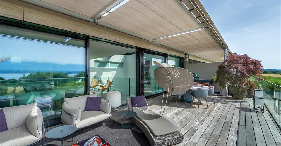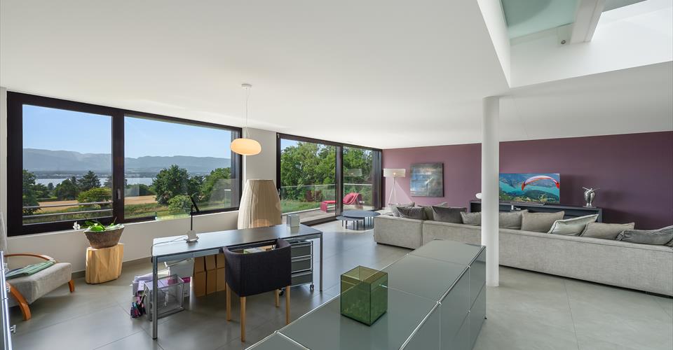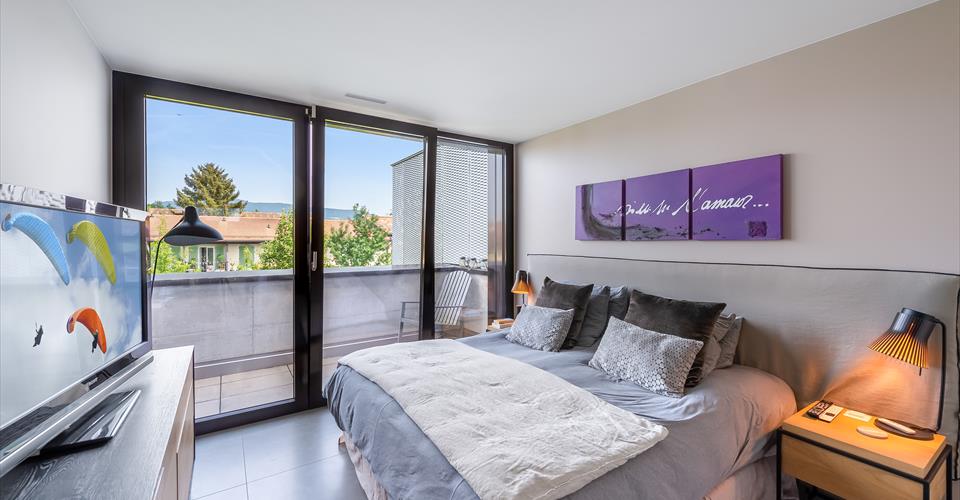 Construit en 2013 et baigné de lumière, ce luxueux appartement en duplex et attique bénéficie d’une vue lac panoramique et de matériaux haut de gamme. Au 1er étage il offre un magnifique salon pourvu d’un puits de lumière zénithale avec de grandes baies vitrées donnant accès à une terrasse, 2 chambres avec balcon, une salle de bains et un 2 wc séparés. Un magnifique escalier nous amène en attique à une vaste cuisine ouverte et à un espace repas s’ouvrant sur une large terrasse de 42 m2 exposée Ouest avec vue sur le lac et sur le Jura. Deux chambres avec terrasse, une grande salle de douche et un wc séparé complètent ce niveau. Résidence de standing avec vidéophone. 2 Caves et 2 places de parking.
