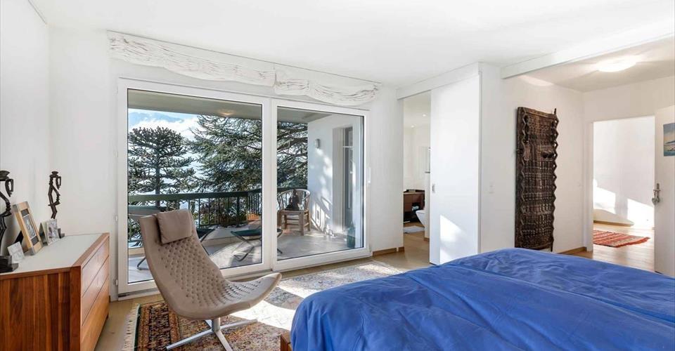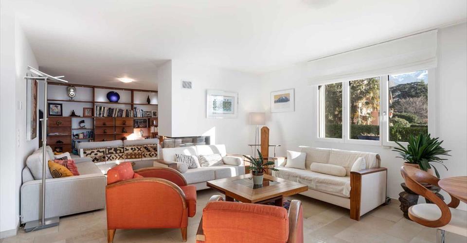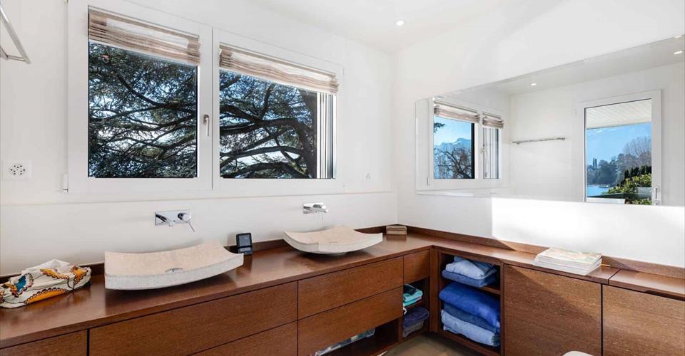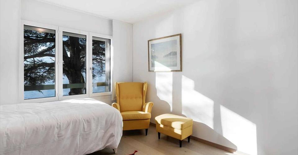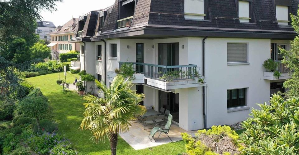 Véritable coup de cœur pour ce magnifique appartement de 6,5 pièces, situé au rez et 1er étage d’une charmante copropriété au bord de l’eau. Deux lots ont été réunis pour composer ce spacieux duplex d’environ 212 m² habitables. De style contemporain, il a été entièrement rénové avec des matériaux de haute qualité. Élégant et décoré avec goût, il saura à coup sûr en séduire plus d’un. De par son orientation, l’appartement est inondé de lumière tout au long de la journée, ce qui lui confère une ambiance chaleureuse. De plus, il bénéficie d’un calme absolu, idéal pour profiter d’un cadre de vie paisible. L’emplacement rare « Pieds dans l’eau » offre aux résidents un cadre de vie privilégié. L’accès à la plage privative et au lac se fait par le jardin privé superbement arboré. Voici sa distribution intérieure : Rez : – Un vaste hall d’entrée avec armoires murales ; – Un spacieux séjour avec cheminée centrale ; – Une cuisine / salle à manger avec accès à la terrasse et au jardin ; – Une chambre (actuellement utilisée comme bureau) ; – Une salle de douche/WC. 1er étage : – Deux chambres à coucher ; – WC/ Salle de bains avec baignoire à remous ; – Une double suite parentale avec dressing, salle de douche/WC et accès au balcon orienté sud-ouest. Un rail à bateau, trois places de parking intérieures dont une avec une borne électrique privée, une place de parking extérieure ainsi que deux grandes caves complètent ce bien d’exception.