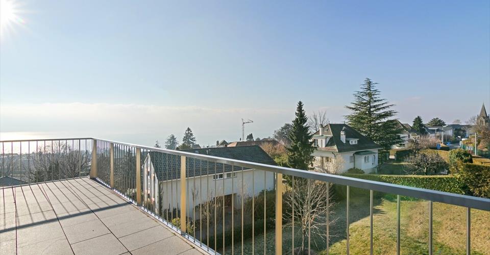 Ce magnifique appartement au dernier étage d’une petite PPE à haut standing de 3 lots construite en 2013, se trouve dans un quartier calme, résidentiel et très prisé de Pully. Occupant tout le dernier étage, il offre 6,5 pièces avec 4 chambres à coucher, chacune avec sa salle de bains privative et son balcon, outre une grande pièce à vivre de plus de 120 m² ! L’appartement offre de très beaux espaces et volumes avec beaucoup de luminosité grâce à son orientation Sud. L’appartement est distribué comme suit : Spacieuse entrée donnant sur un grand espace ouvert salon/salle à manger, coin cheminée, cuisine ouverte donnant sur un balcon avec vue le lac et les montagnes, avec un coin economat/buanderie et un toilette visiteurs. La partie nuit se trouve dans la partie Est de l’appartement et est composée de 4 chambres à coucher, chacun avec sa salle de bains et un accès au balcon. Moderne et équipé avec la technologie actuelle, cet appartement saura vous séduire par son originalité et rareté sur le marché ! Une grande cave, une cave à vin, ainsi qu’un garage double complètent l’appartement. – Vue panoramique sur le lac et les montagnes – Espace de vie de plus de 120 m² – 4 chambres avec salle de bains en suite – Immeuble de haut standing – Toutes les commodités à proximité – Quartier calme et résidentiel