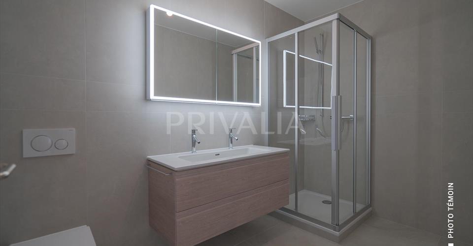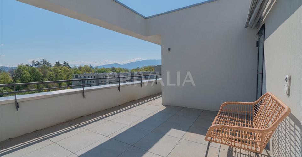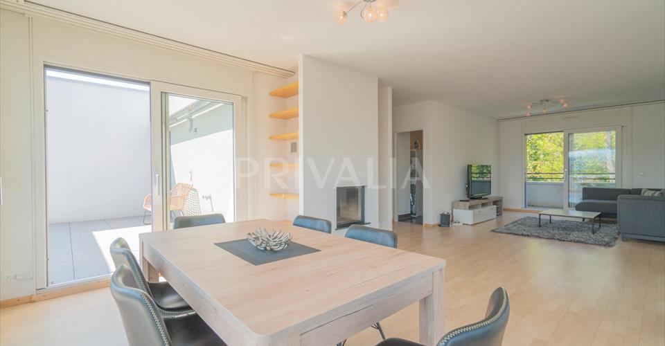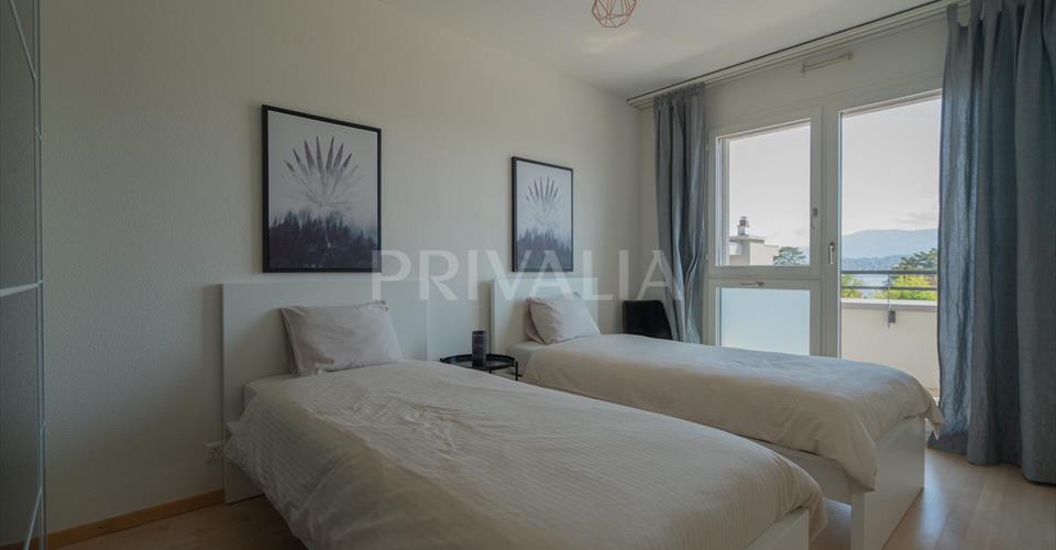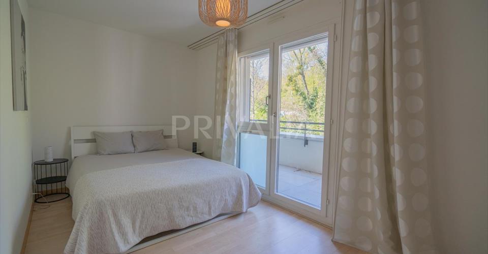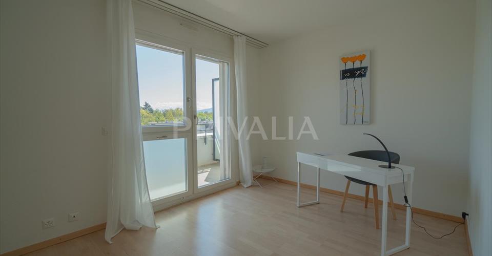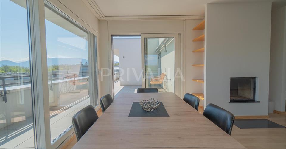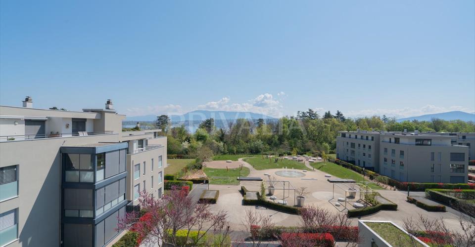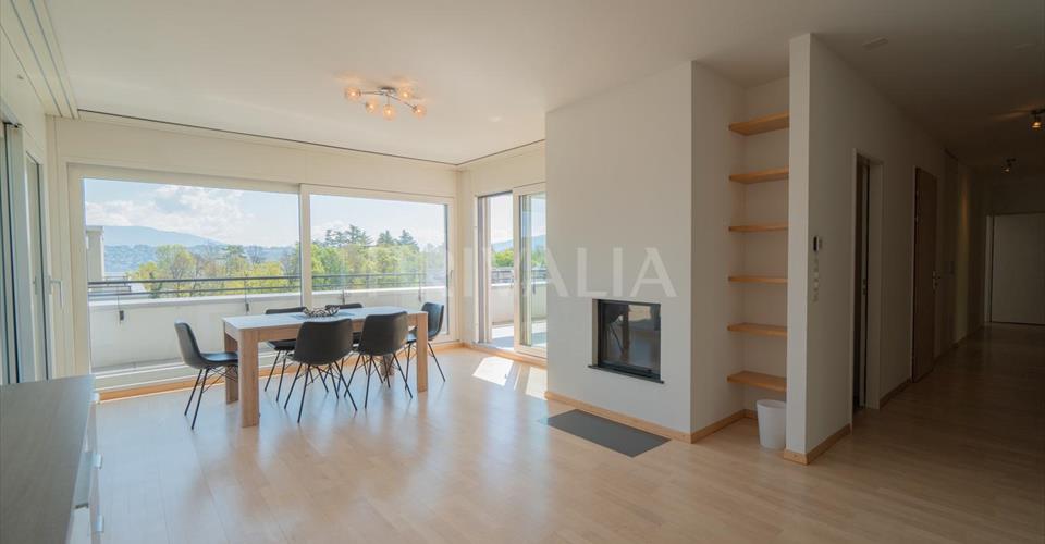 Sur la rive droite, dans la commune prisée de Chambésy, dans une résidence sécurisée située au sein d’un écrin de verdure, ce bel appartement de 6.5 pièces, dont 3 chambres à coucher, offre une superficie de 121 m2 habitables. Situé au 3ème étage, cet appartement offre des prestations remarquables telles que cuisine entièrement équipée et agencée, salles d’eau modernes, chauffage au sol avec régulateur “p-touch”, buanderie privée ou encore stores électriques. Il se distribue comme suit : – Hall d’entrée – WC visiteurs – Séjour / salle à manger avec cheminée, accès terrasse – Cuisine fermée agencée et équipée – Chambre parentale avec salle de bains / WC ensuite – 2 chambres à coucher – Salle de douche avec WC – Réduit avec buanderie équipée 1 places de parking en sous-sol (en sus à CHF 250.-), une très grande cave, des beaux espaces de jeux extérieurs pour les enfants et un parking visiteurs viennent compléter l’ensemble. En outre, la résidence est sécurisée par des caméras de surveillance ainsi que par une société de sécurité. A proximité des commodités, des transports publics ainsi que de l’arrêt de train de Chambésy, à quelques minutes en voiture des organisations internationales et de l’aéroport, à une dizaine de minutes du collège du Léman et de l’Ecole Internationale de Genève – campus des Nations. Charge en sus à CHF 690.- / mois.
