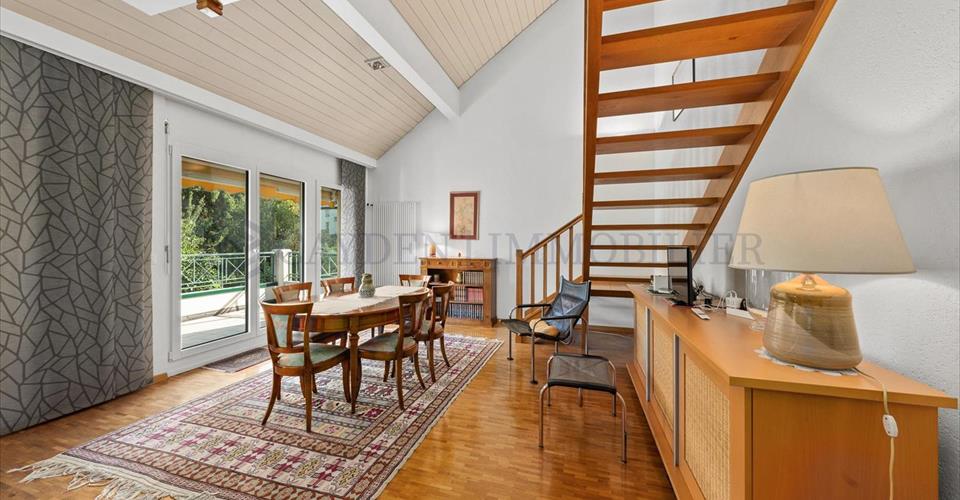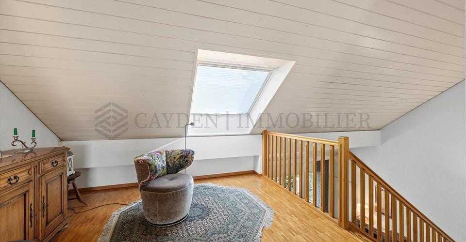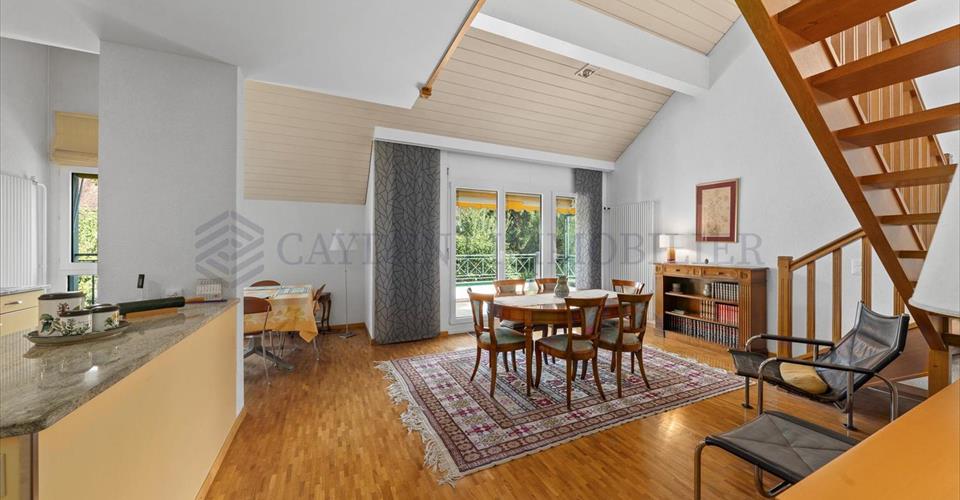 Cayden Immobilier vous présente ce spacieux duplex au sein d’une agréable copropriété proche de toutes les commodités. Cet appartement d’une généreuse surface PPE de 157 m2 complétée de 13 m2 de balcons, en très bon état, bénéficie d’une belle luminosité sans vis-à-vis. Le bien se distribue de façon suivante : Premier niveau : 90 m2 – Hall d’entrée avec armoires – Buanderie avec rangements – Grand séjour/salle à manger avec belle terrasse – Cuisine équipée ouverte sur le séjour – Chambre parentale avec accès au balcon – Deuxième chambre – Salle de douche avec toilettes Etage : 67 m2 – Grande galerie avec un espace TV / lecture / jeux – Troisième chambre – Salle de bain avec baignoire et toilettes En complément : – Grande cave – Box double avec porte motorisée, d’un montant de 80’000 CHF, inclus dans le prix de vente Un garage à vélos est également à disposition des propriétaires. N’hésitez pas à contacter Lana Tavares pour toute information complémentaire ou visite.