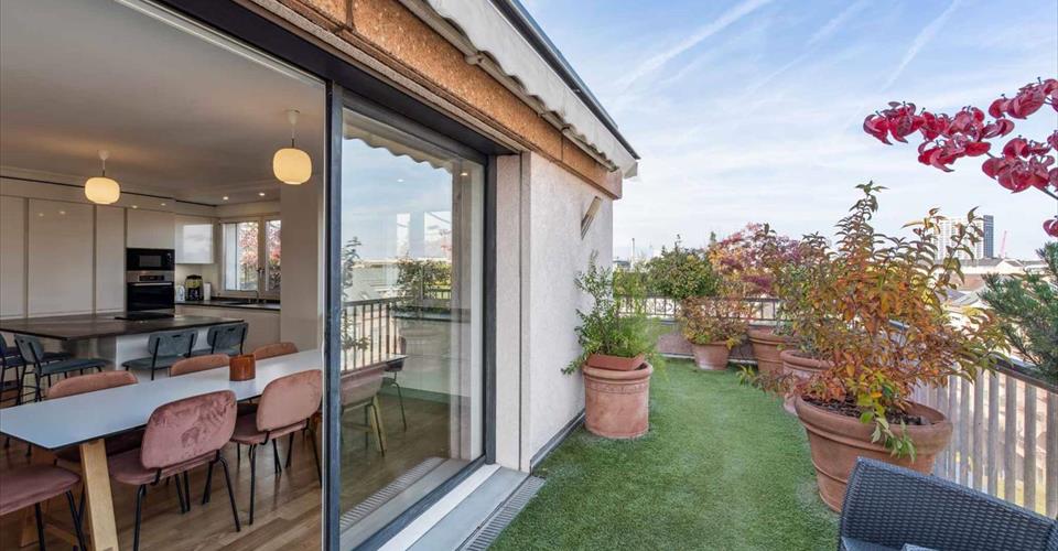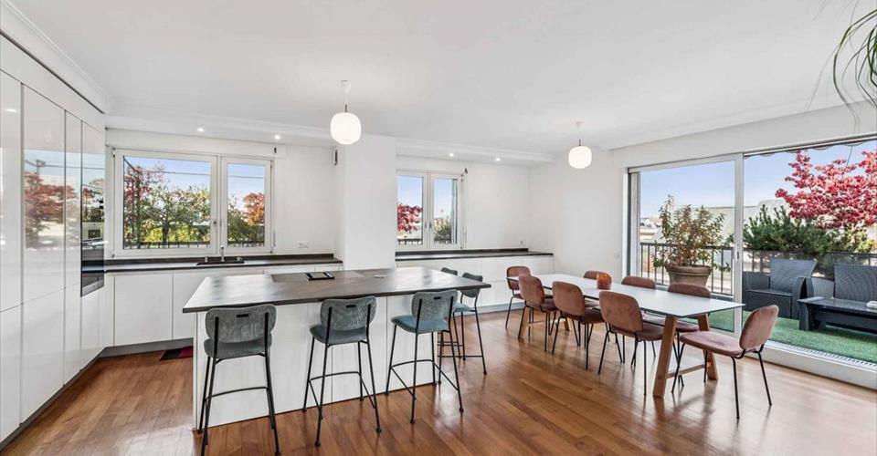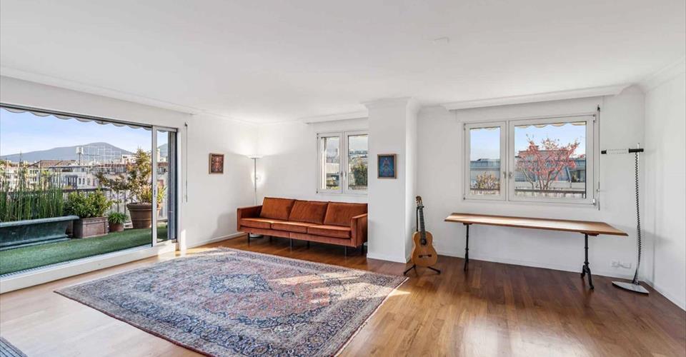 Idéalement situé à Carouge, ce très bel attique en pignon de 6 pièces occupe l’intégralité du dernier étage de l’immeuble et bénéficie d’une triple exposition Sud-Est et Nord. Offrant une surface PPE de 205 m² et une vaste terrasse de 141 m², l’appartement séduit par sa vue dégagée sur la ville et sa localisation. Ce bien est la réunion de deux lots et conserve donc ses deux entrées ; il se réparti comme suit : La partie jour propose un vaste séjour avec cheminée ainsi qu’une belle cuisine ouverte équipée avec îlot et une salle à manger. Un dégagement avec placards mène à la partie nuit qui offre 3 chambres, dont deux en suite avec salle d’eau complètes. Un bureau / chambrette, une salle de douche et un espace buanderie (pouvant être retransformé en salle de douche) viennent parfaire cette partie. Sa vaste terrasse, accessible depuis toutes les pièces, offre une vue panoramique imprenable sur la ville et le Salève. Situé dans l’hypercentre, à proximité immédiate de toutes les commodités, il bénéficie d’un emplacement privilégié. Une place de parc en sous-sol ainsi que deux caves complètent ce bien rare à la vente!